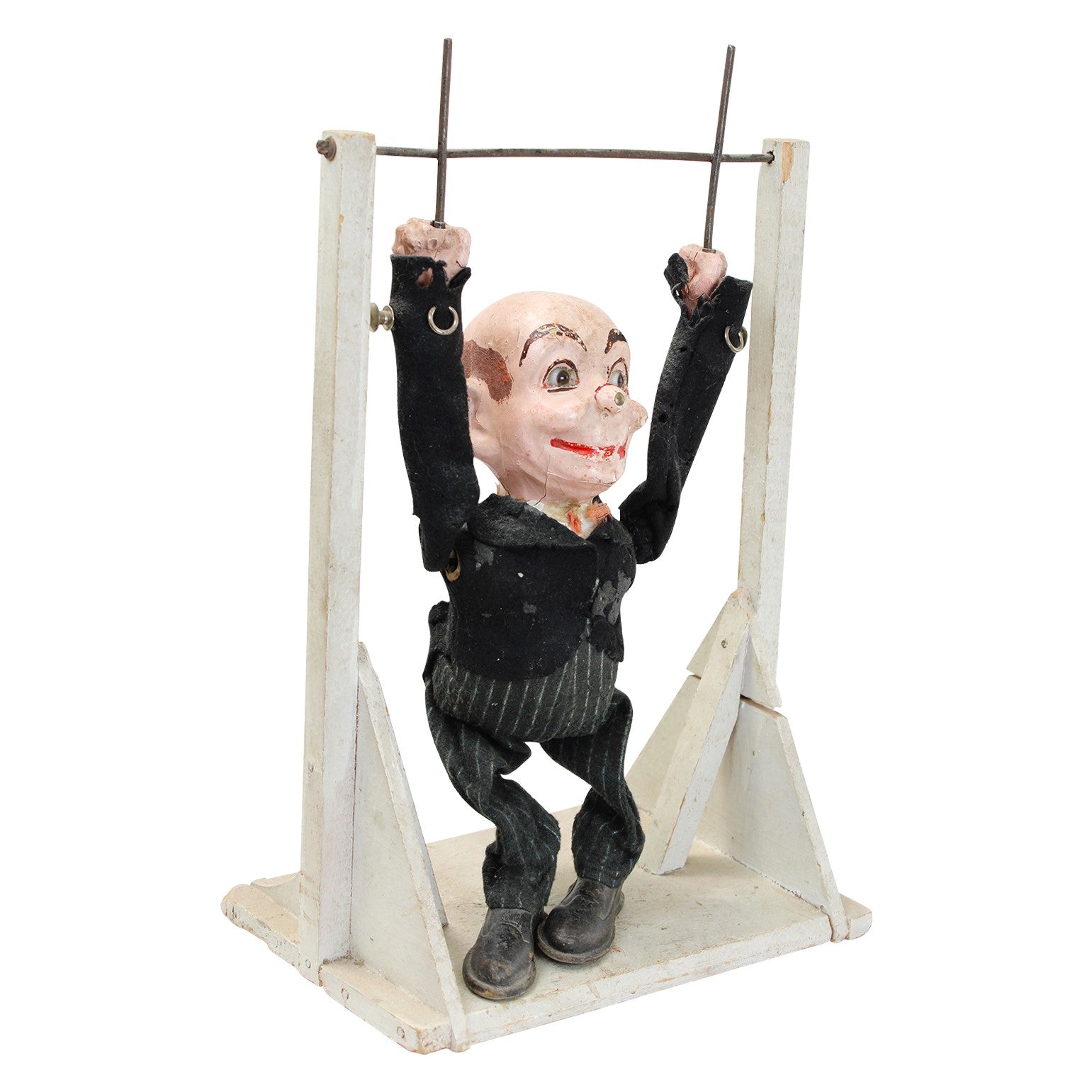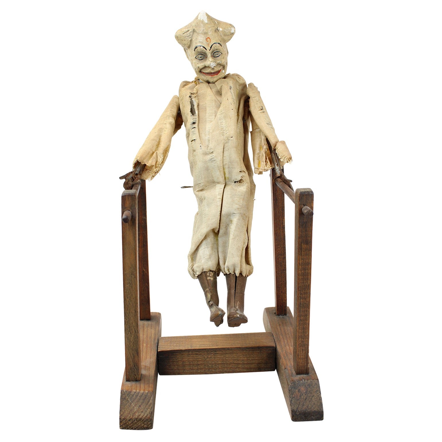 Antique French Mechanical Metal Acrobat Clown with Painted Bisque Head and Chair