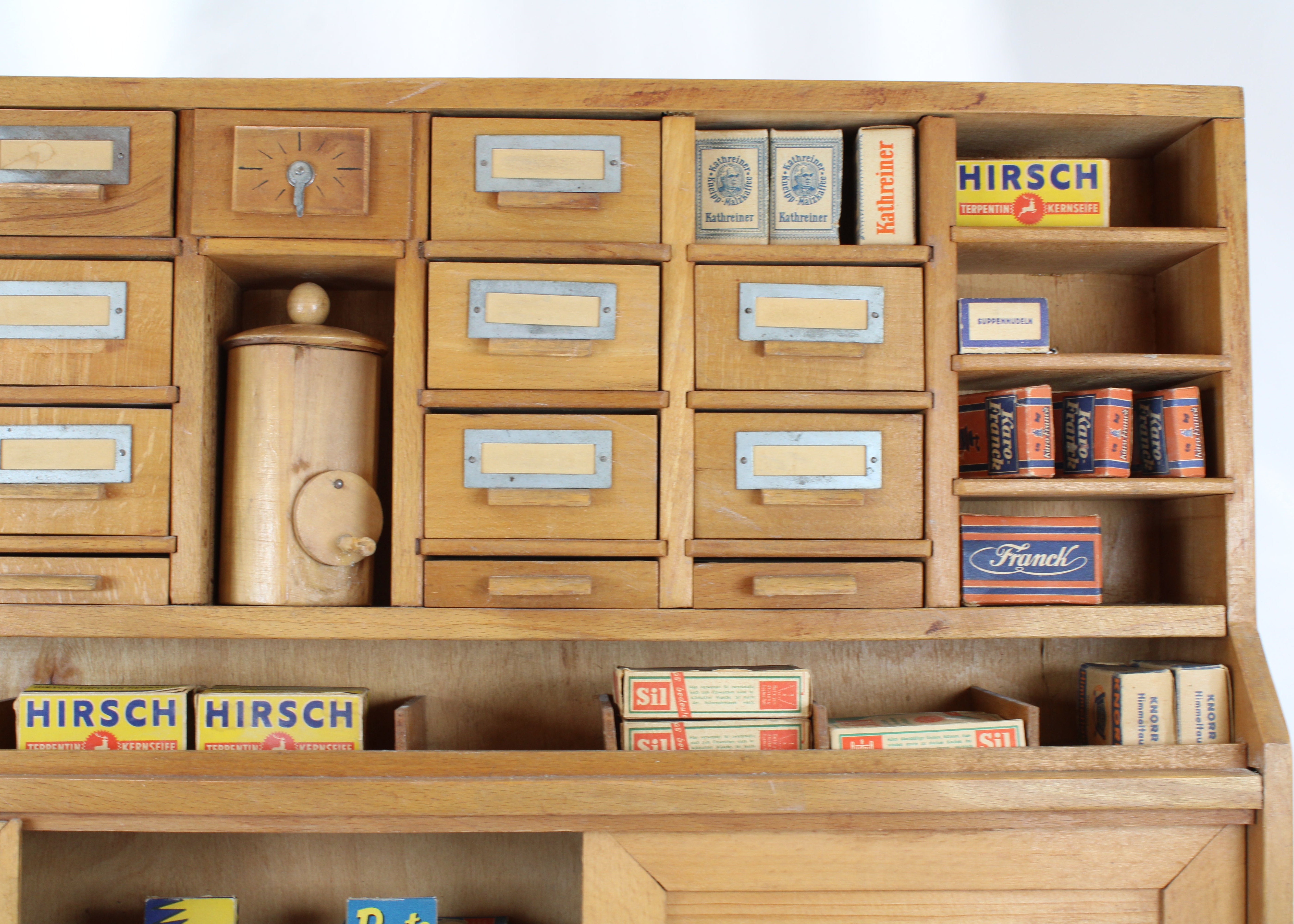 Antique Miniature Two-Piece Wood General Store with Shelves, Drawers, Cabinets & Over 100 Play Product Boxes