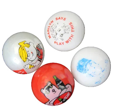 4 - 1" Marbles- Coca-Cola, Dairy Queen/Dennis the Menace, Marilyn Monroe & Mickey Mantle