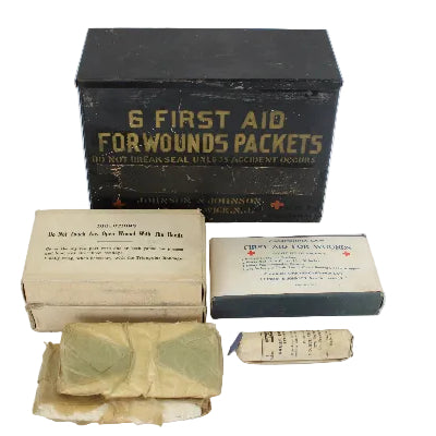 WWII Johnson & Johnson Metal Hanging Box of First Aid for Wounds Packets - 3 Unopened Packets Included