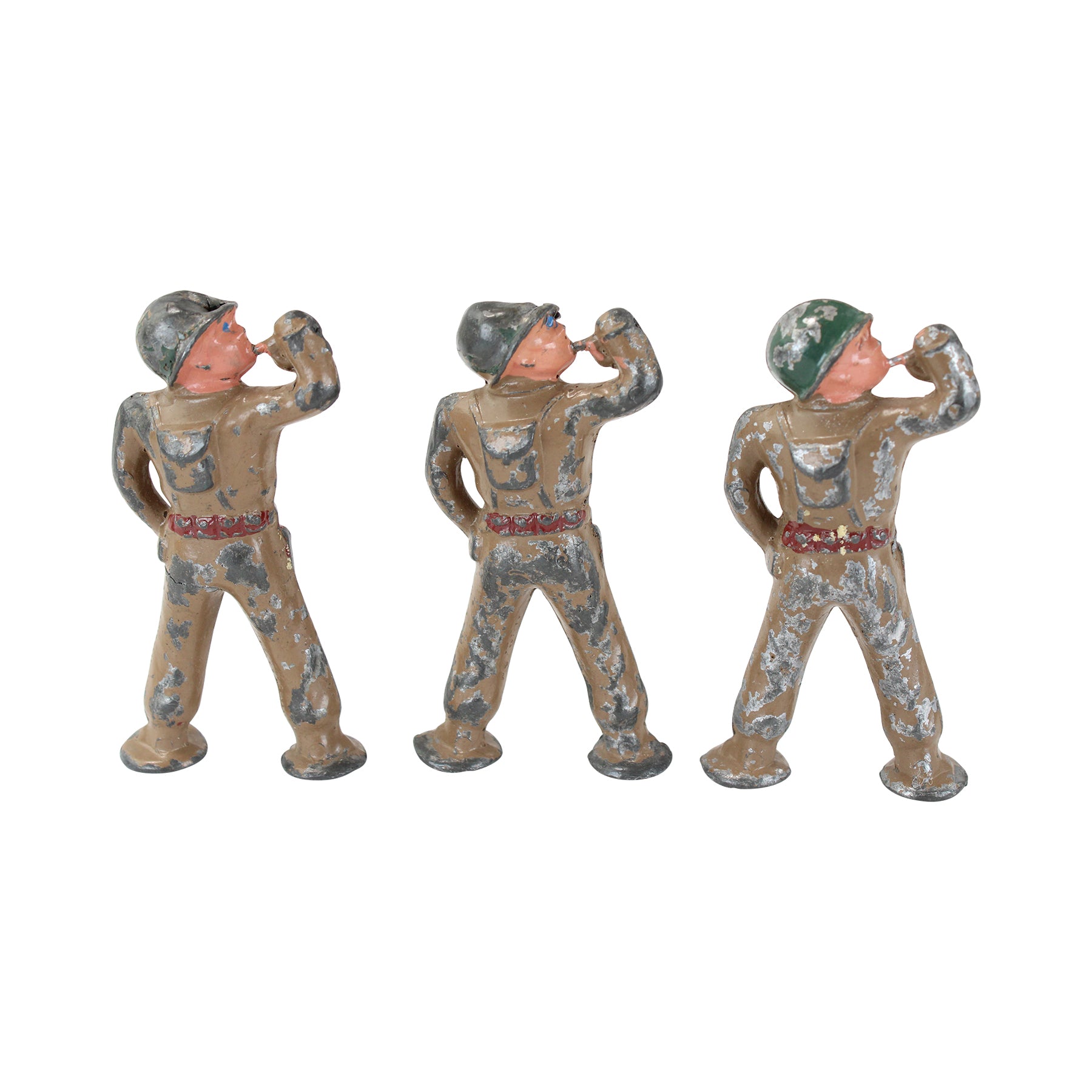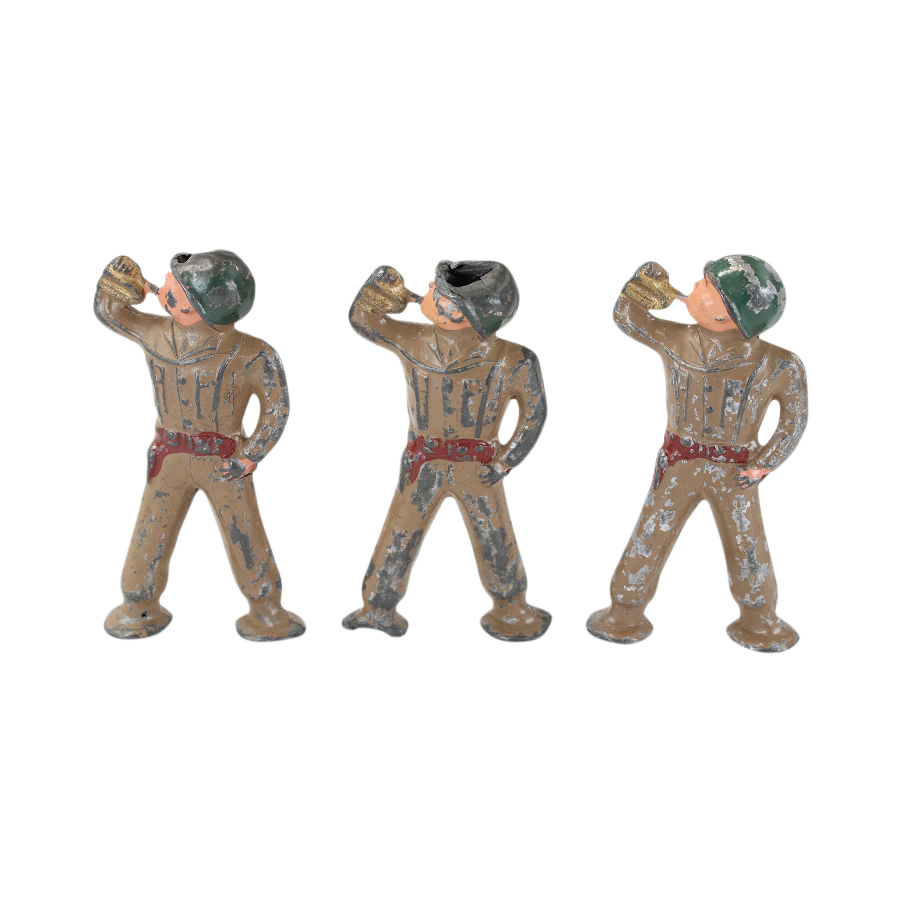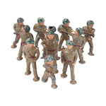 This eleven piece soldier set features servicemen in their olive green uniforms. Each soldier wears the green helmet and seven of the figures are carrying weapons with the other figures being buglers and one senior officer. There is some paint loss on all figures but most features are easily distinguishable. The figures are about 2 1/2" tall and were probably manufactured in the 1950's to early 1960's.
