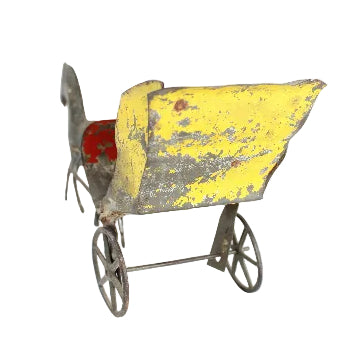 The tin (including the two spoked wheels) remains in very good condition with the exception of a loose but firmly attached metal seam on the rear side panel of the carriage. The original paint is worn and missing in spots but the original colors of the carriage (yellow and red) and on the black horse remains distinguishable.