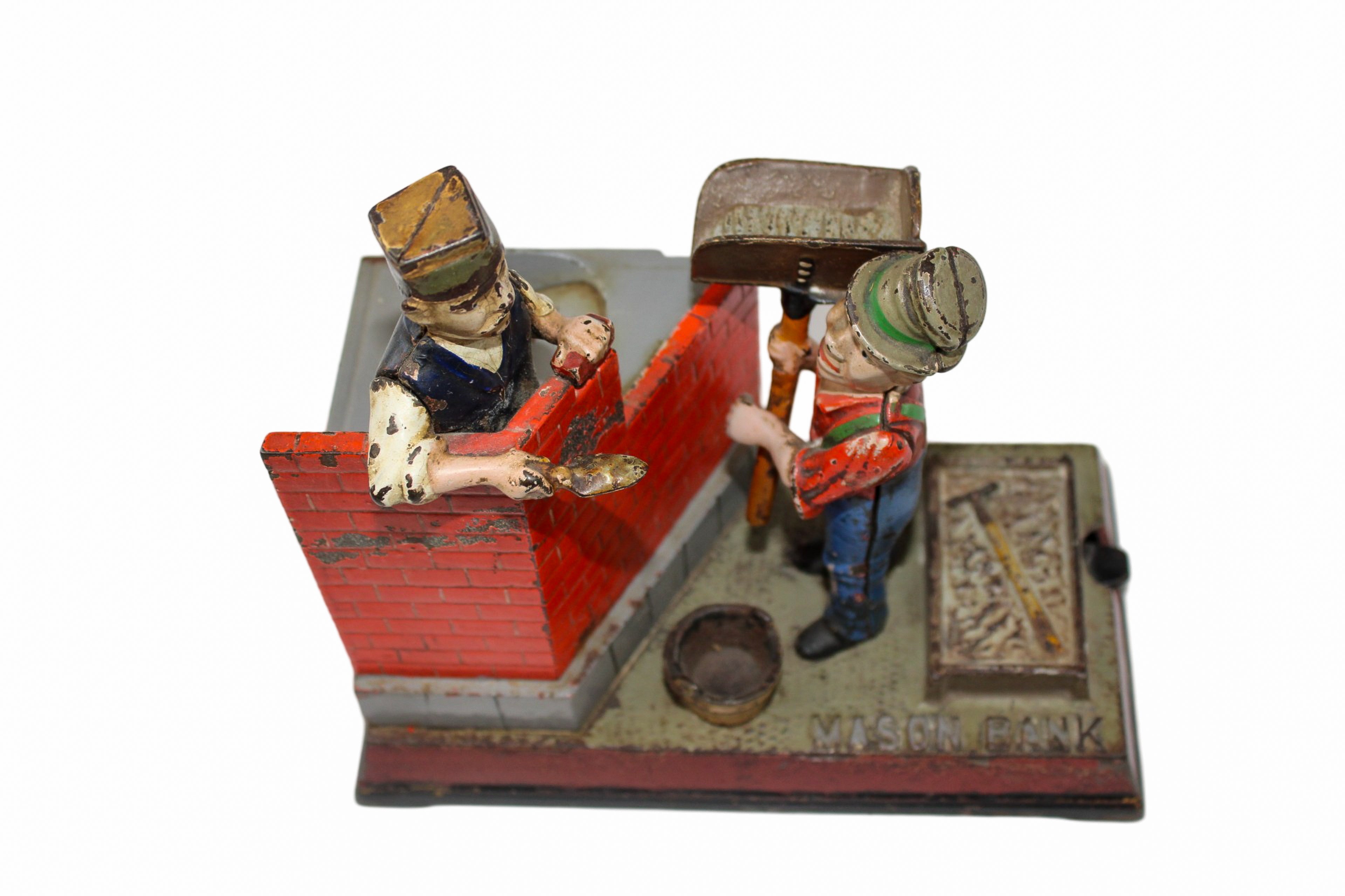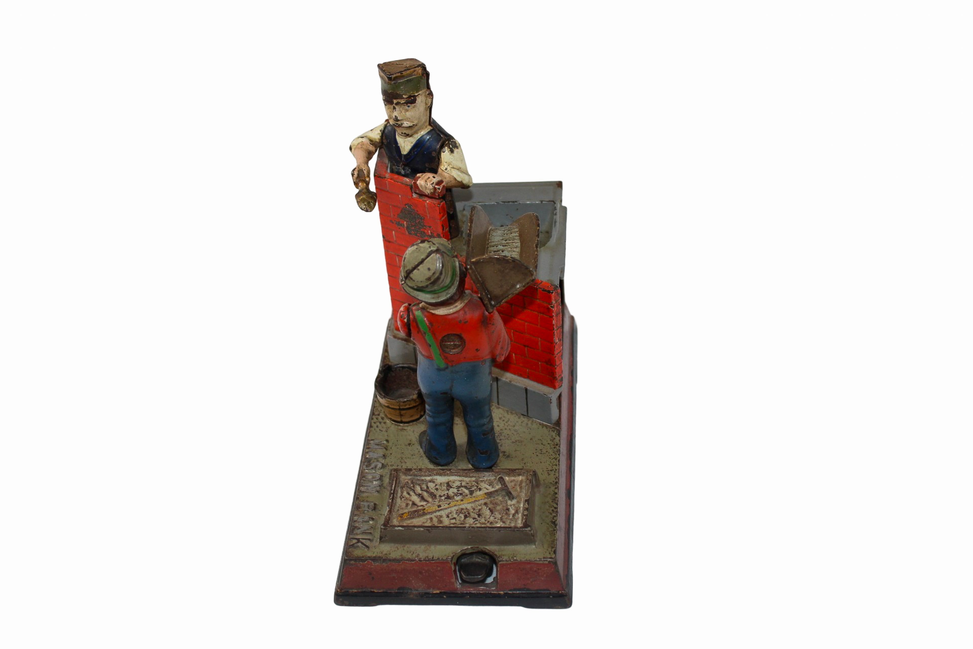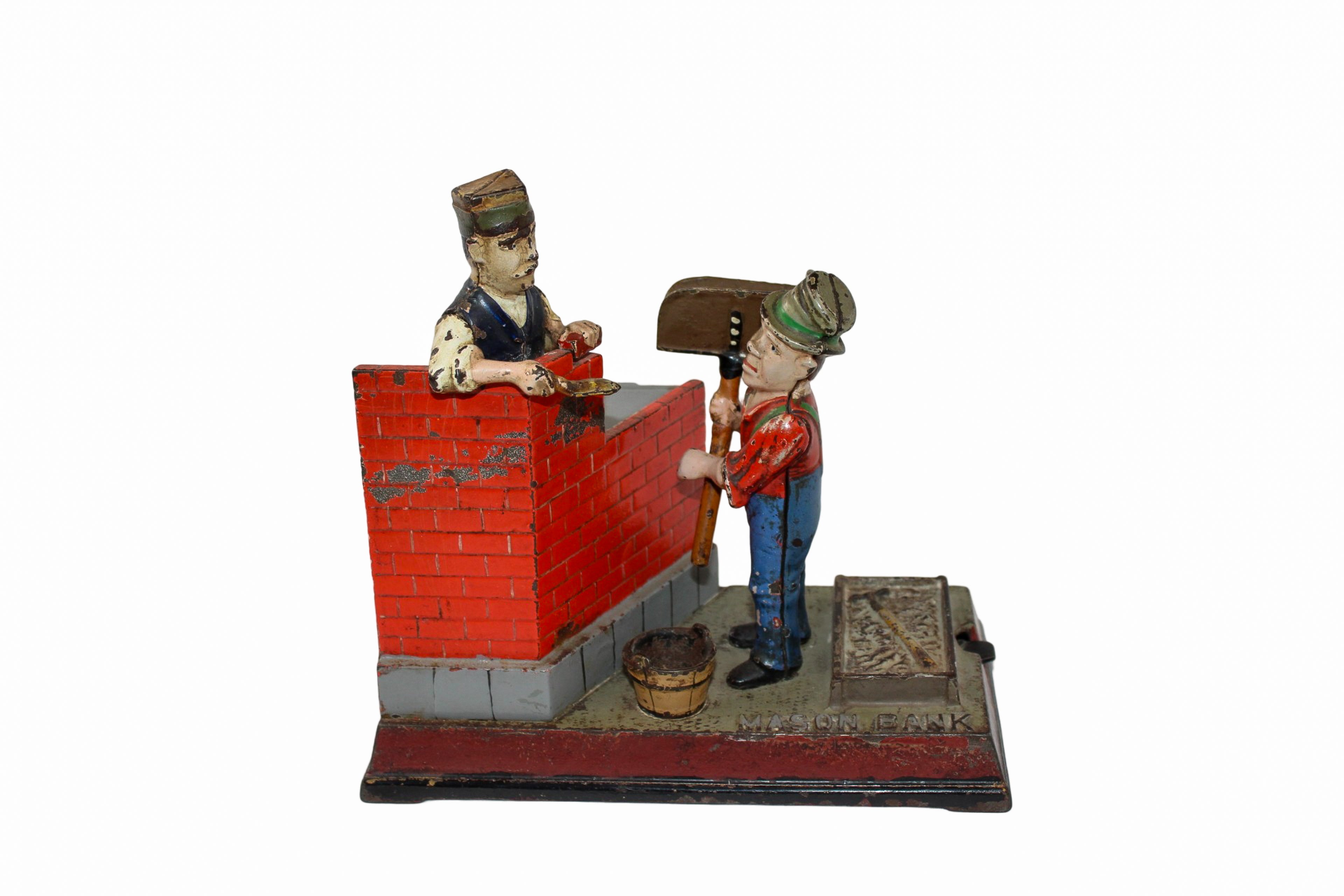 These mechanical banks were built to be sturdy and when a coin is placed into the hod box in the hands of the hod carrier, you press the lever to dump the coin into the hopper next to the brick mason while the brick mason raises his hands to mortar a brick to help build a wall.