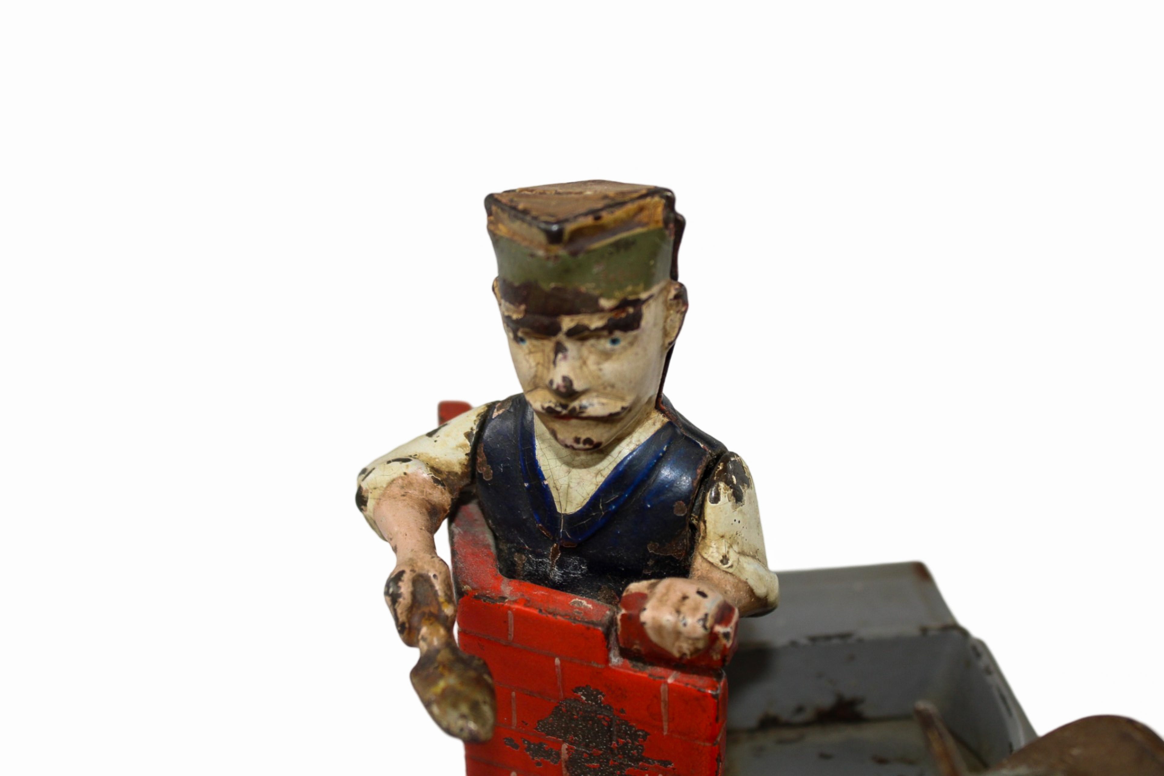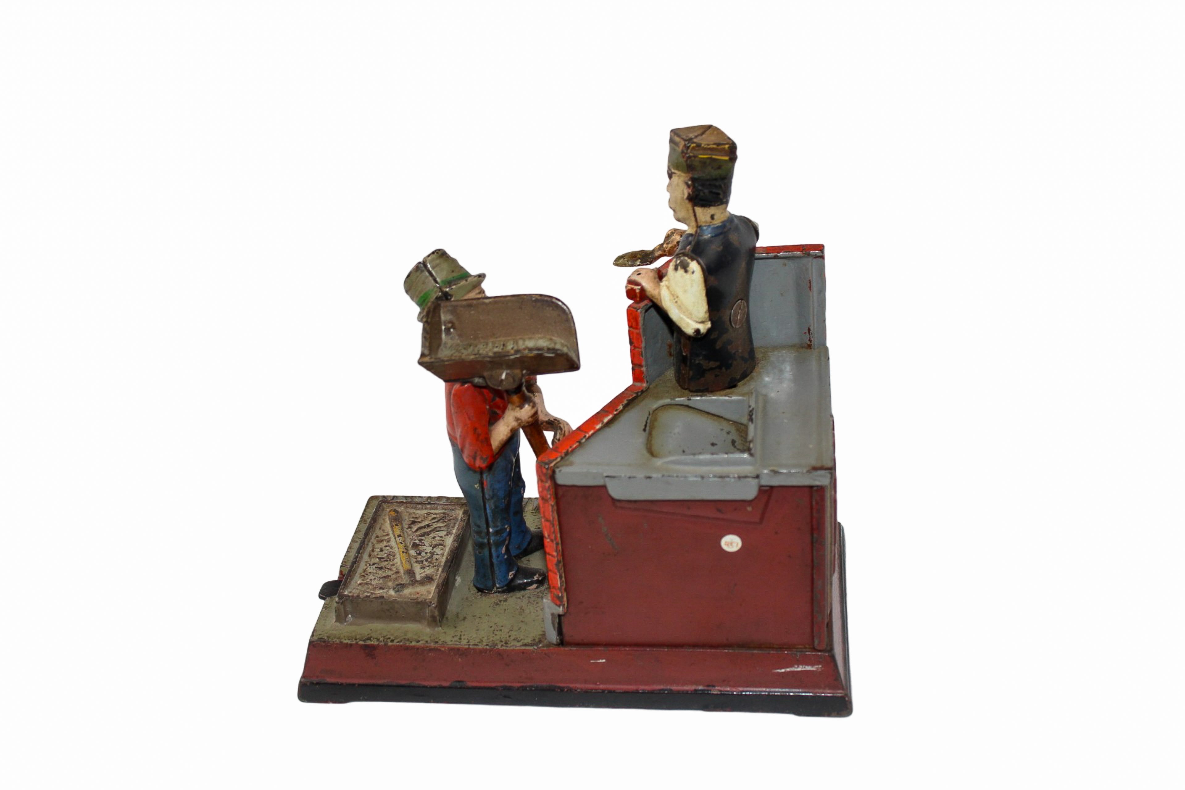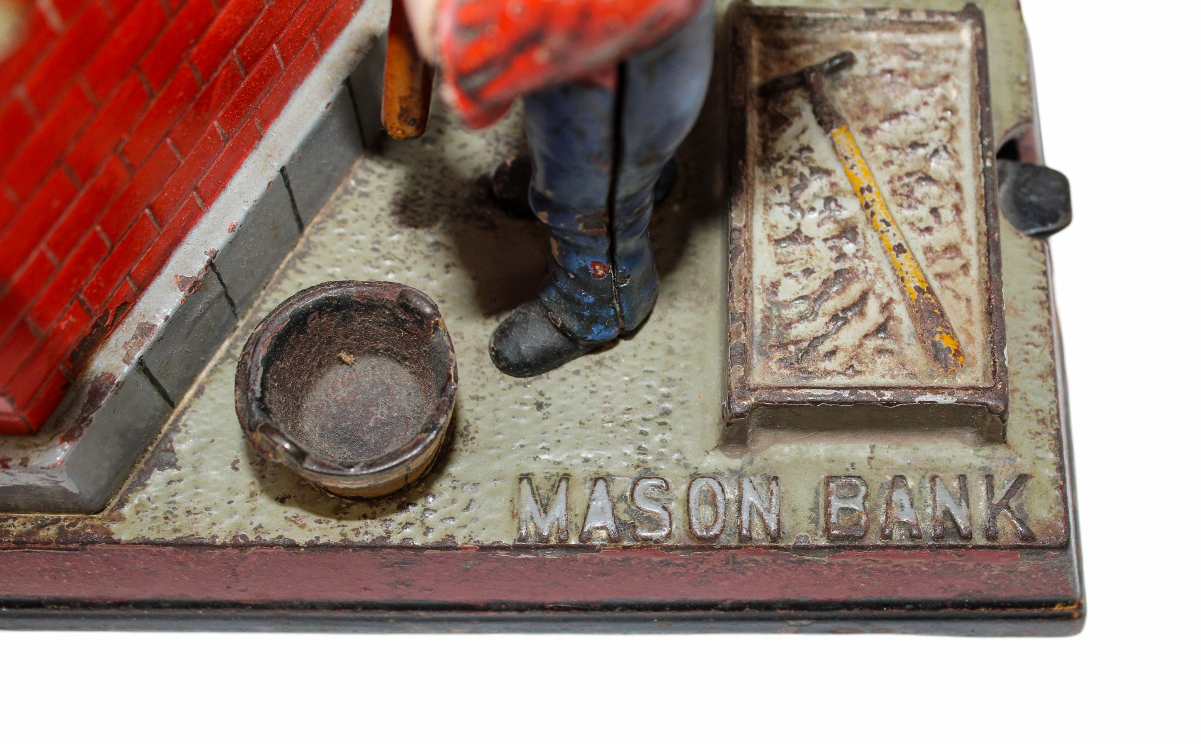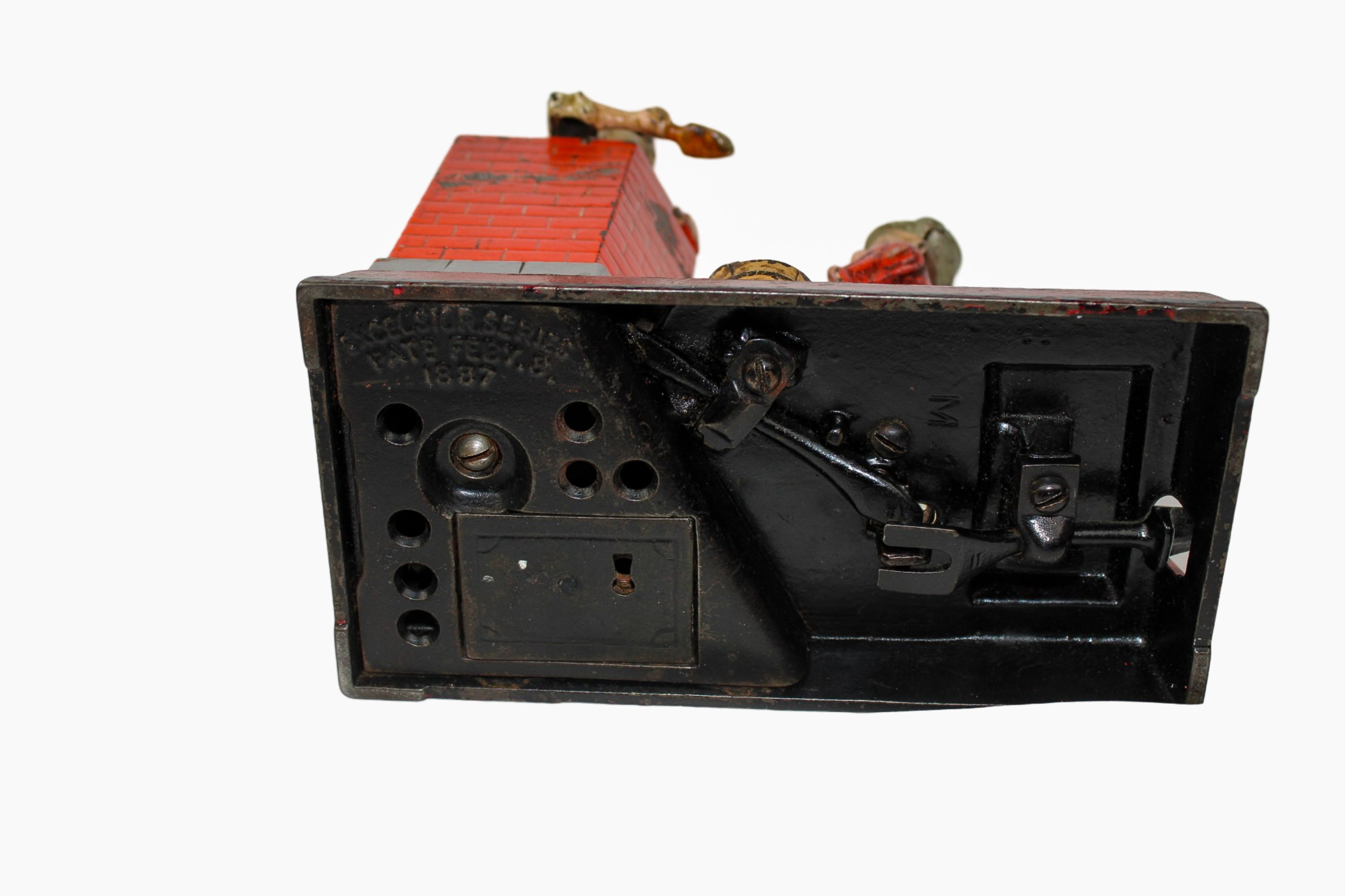These mechanical banks were built to be sturdy and when a coin is placed into the hod box in the hands of the hod carrier, you press the lever to dump the coin into the hopper next to the brick mason while the brick mason raises his hands to mortar a brick to help build a wall.