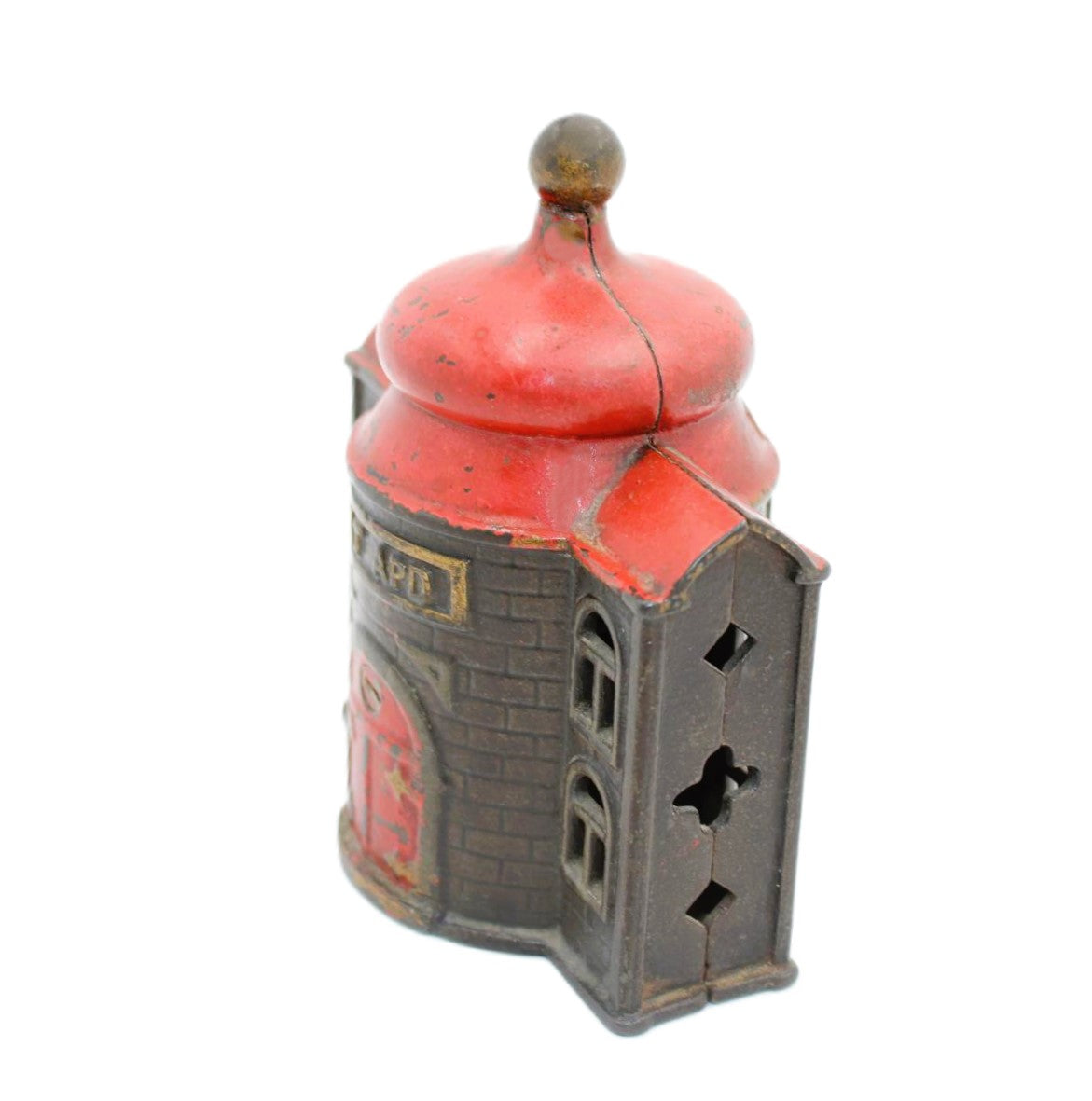 When the knob above the building's front door is pressed, a small spring-loaded drawer slides out, by placing a coin in the drawer and pressing in, the coin is deposited into the bank. The original coin trap cover is present but the key is missing.
