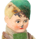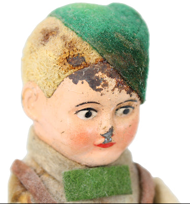 The winding mechanism worked well when tested. The boy has metal legs and is dressed in a felt outfit and hat that remains in very good condition. There is some dark staining on a portion of the blonde hair, green hat, and upper forehead.