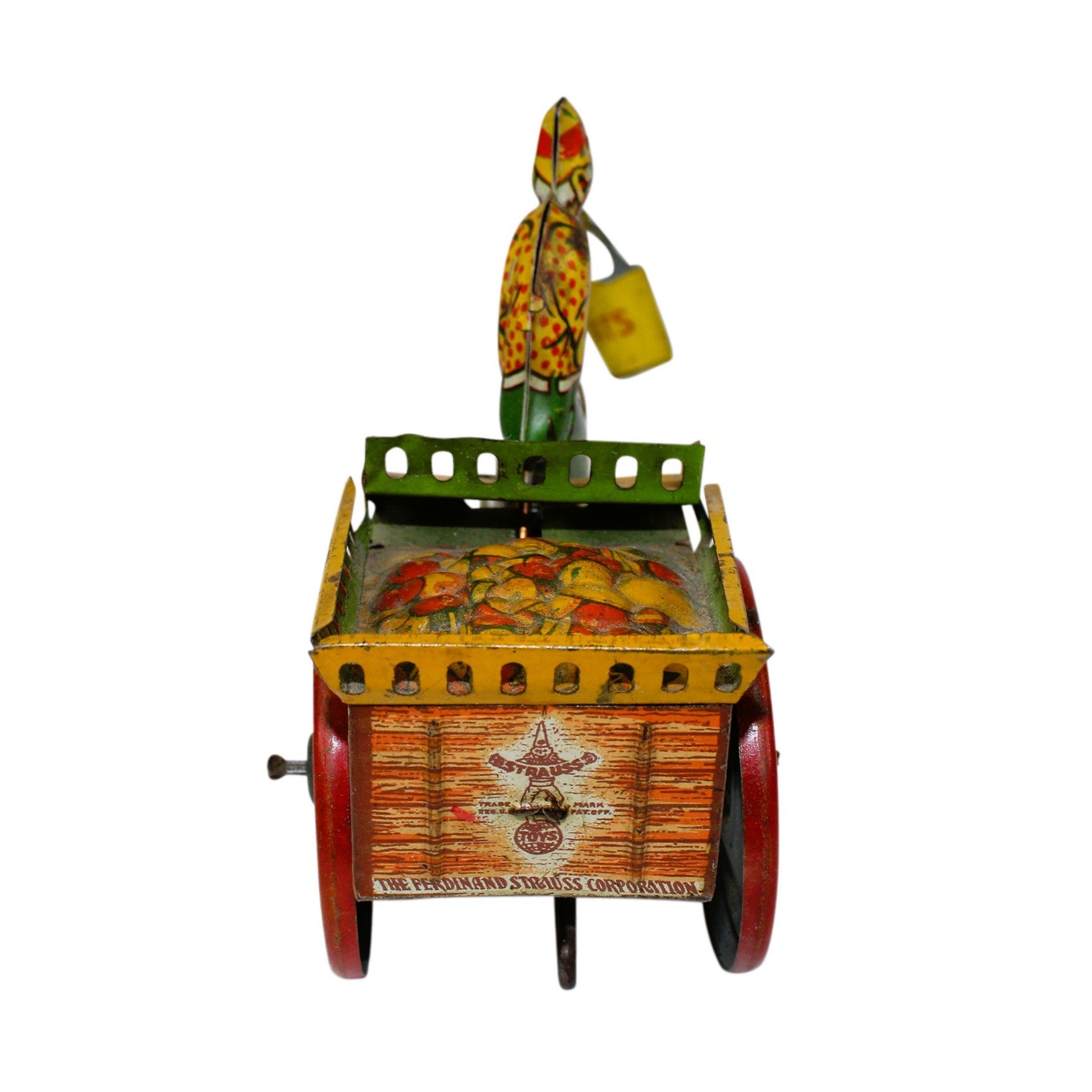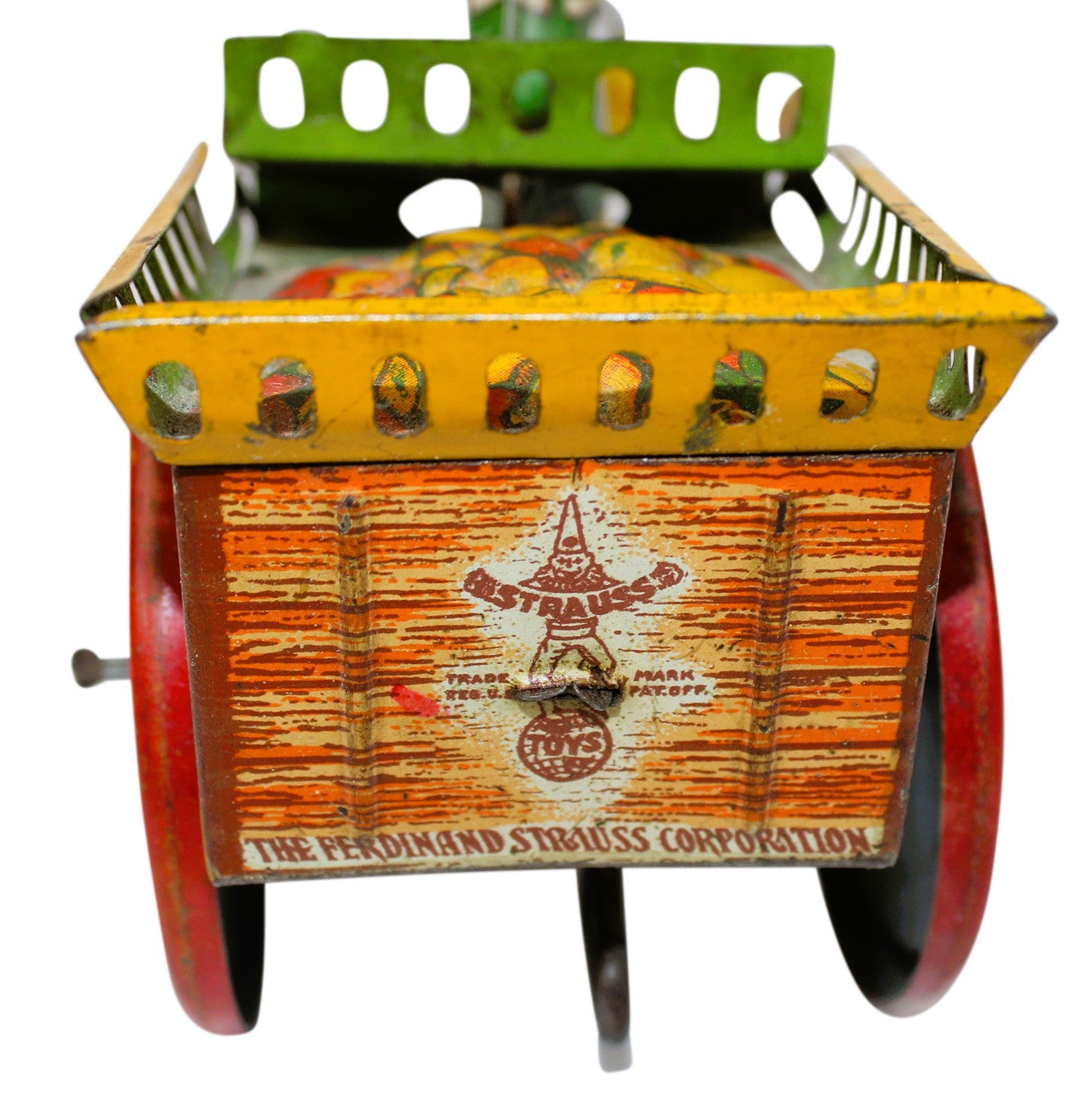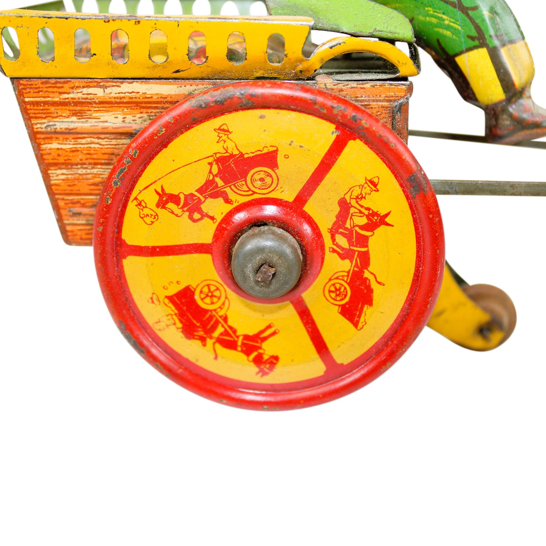 The Strauss logos, painted wheels, donkey, and oat pail show very well. The original donkey ears and rope tail are present. This tin is a wonderful example of some of Strauss's best work.