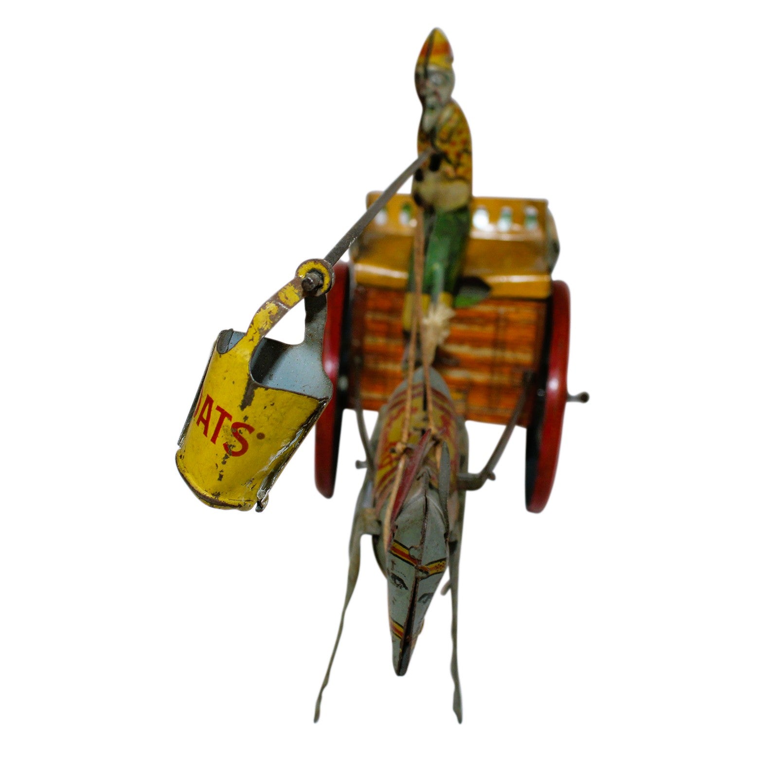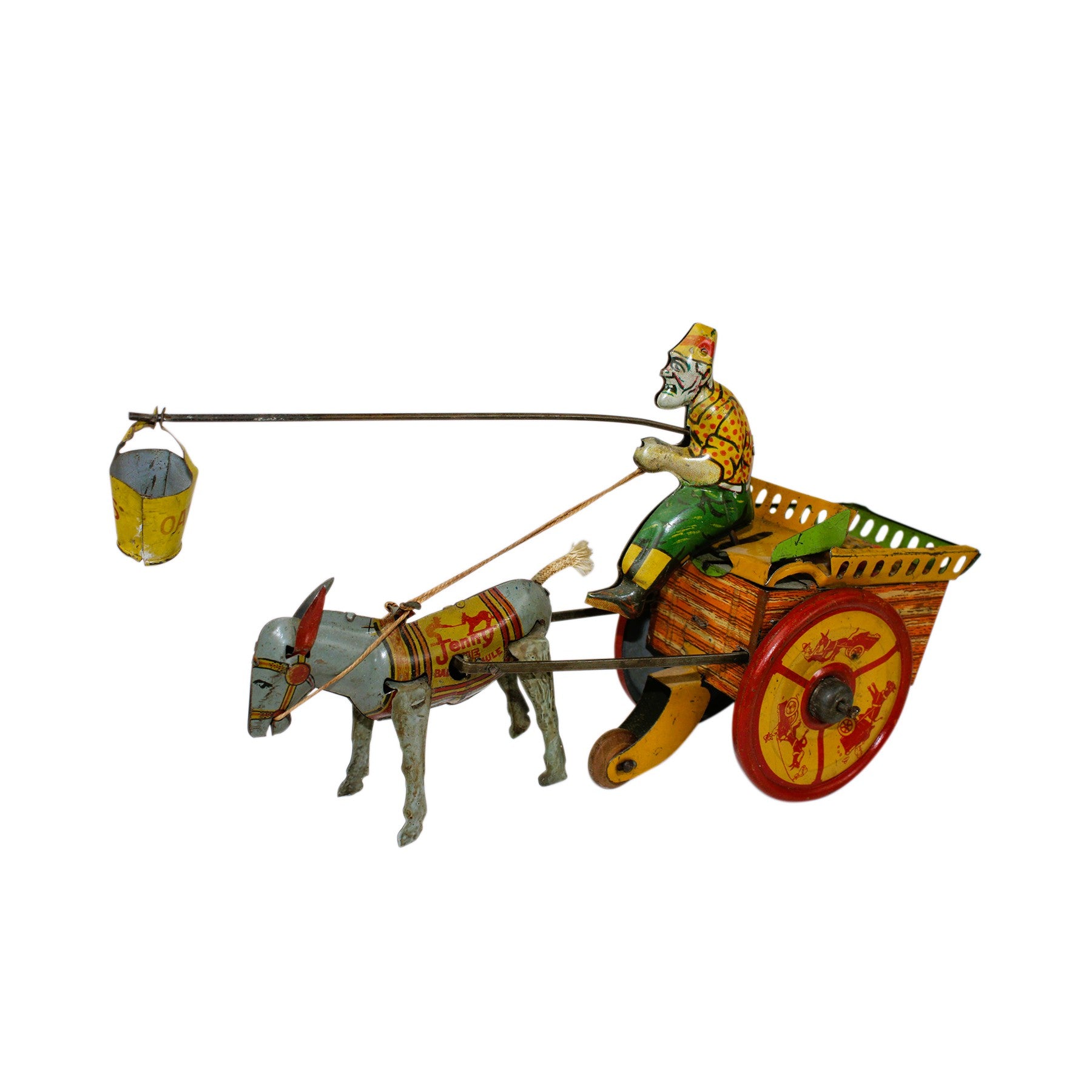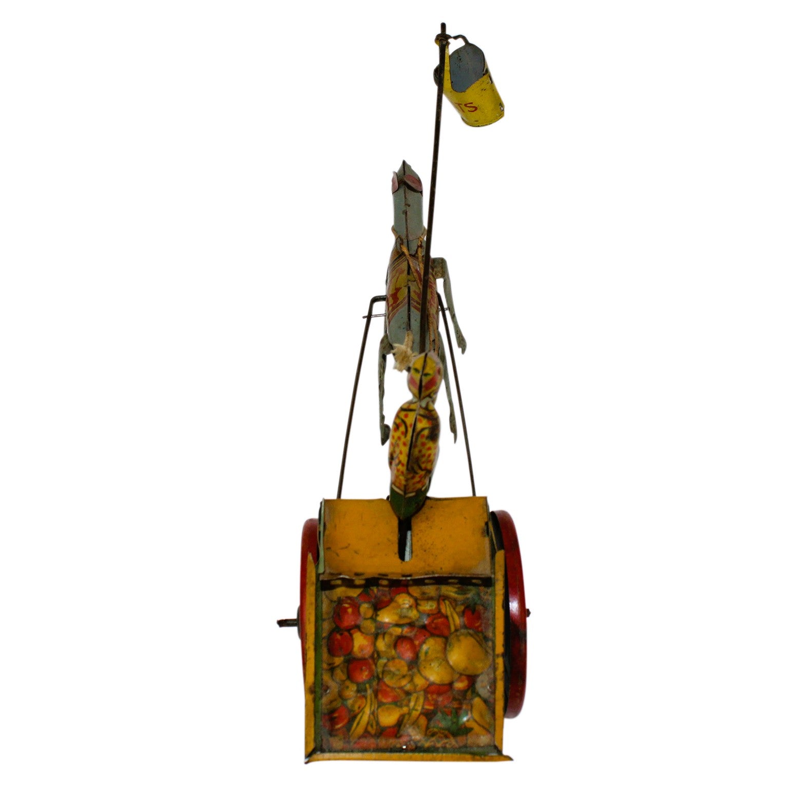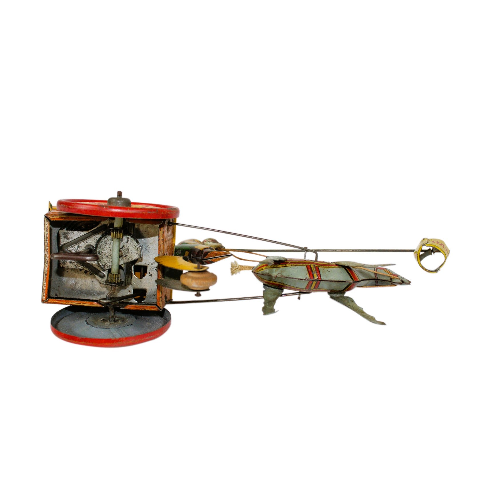 This rare 10" long tin moves back and forth when wound as the farmer holds the grain pail attached to a pole in front of the mule that is bucking up and down.