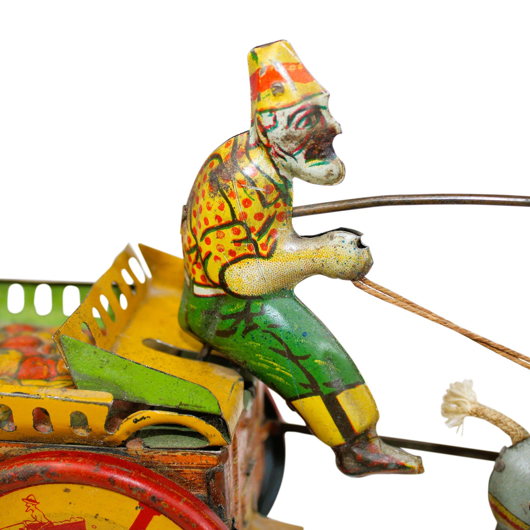 When tested, the winding mechanism worked very well and all wheels and hubs are tight. There are very few flaws on the tin, but there is some minor fading and oxidation on the melons painted on the cart and some paint loss on the farmer's face.