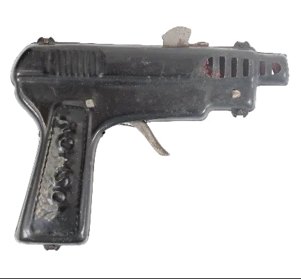 This antique 4-1/2" black metal gun uses replaceable flints to create sparks when the trigger is pulled.
