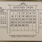 The calendar is turned to January 1929. The dimensions are 6" long, 3-3/4" deep, and 1-1/2" tall.