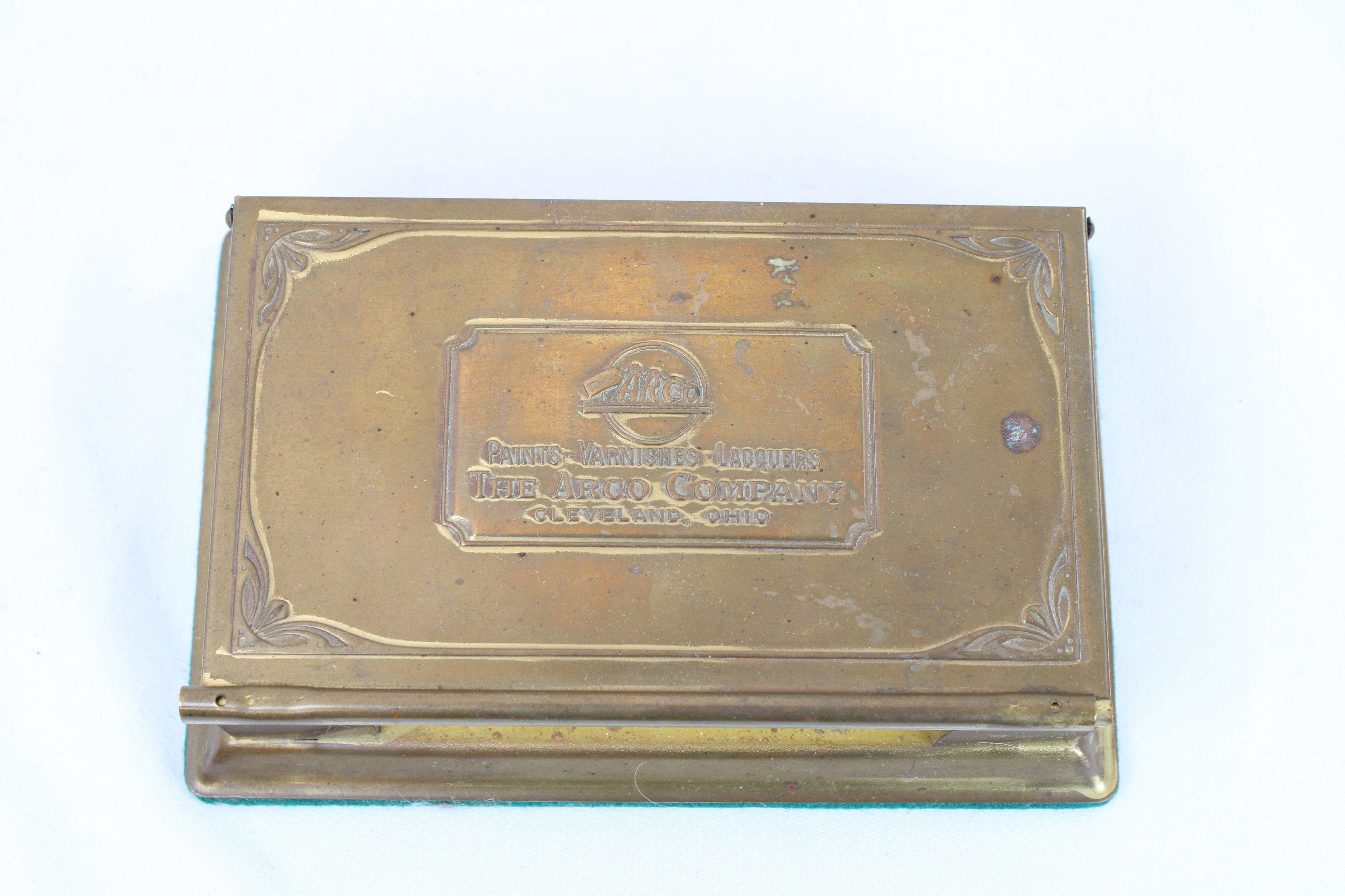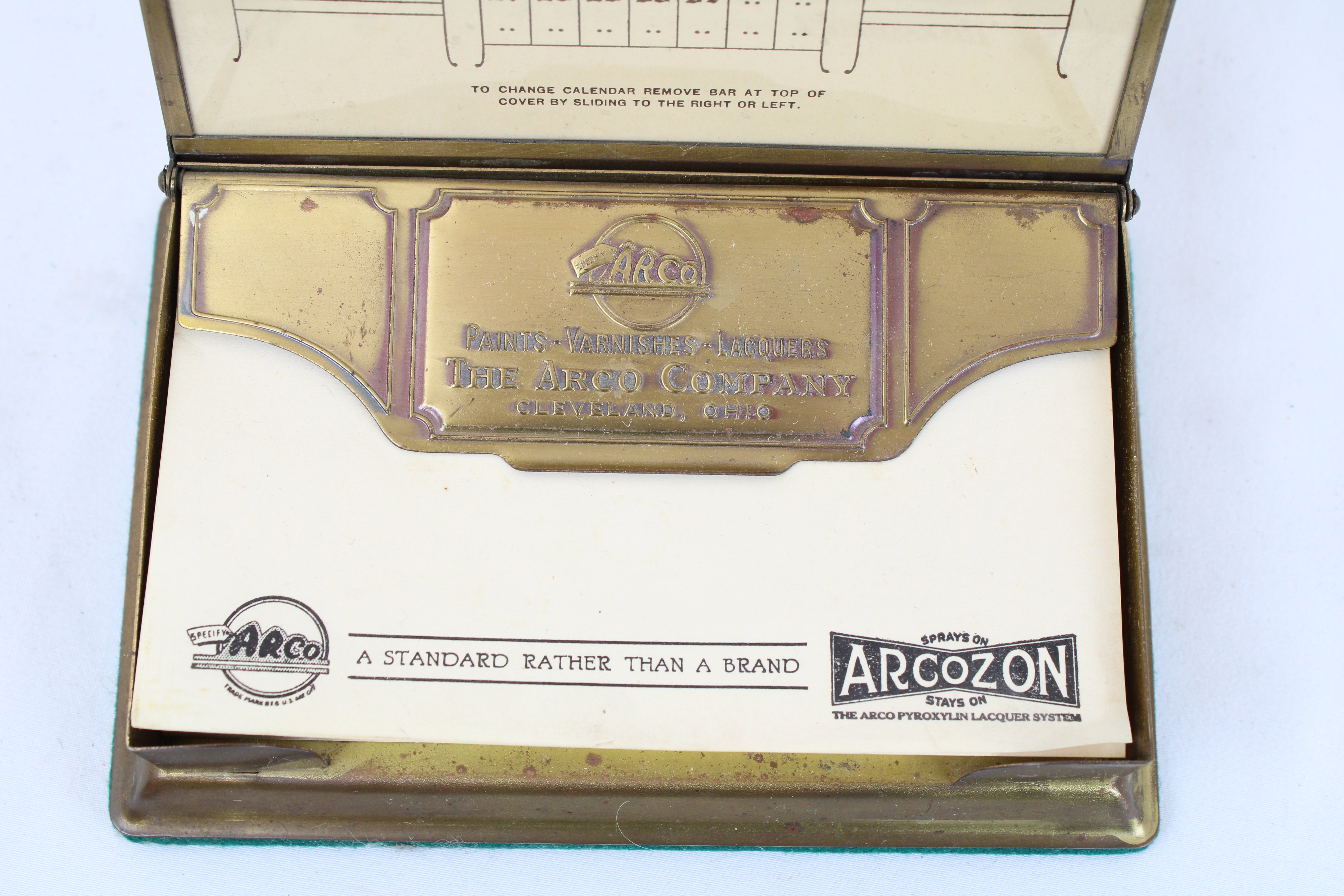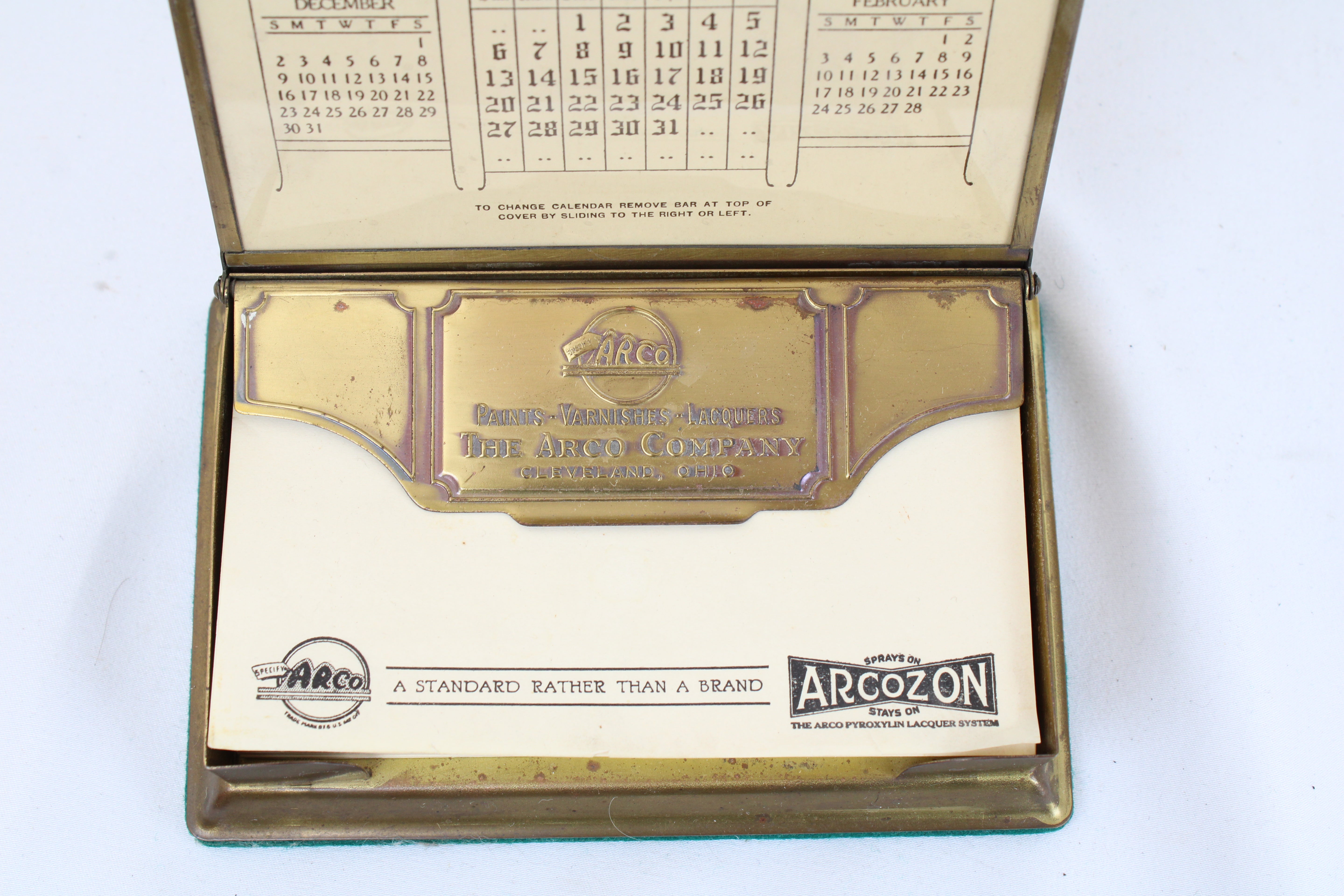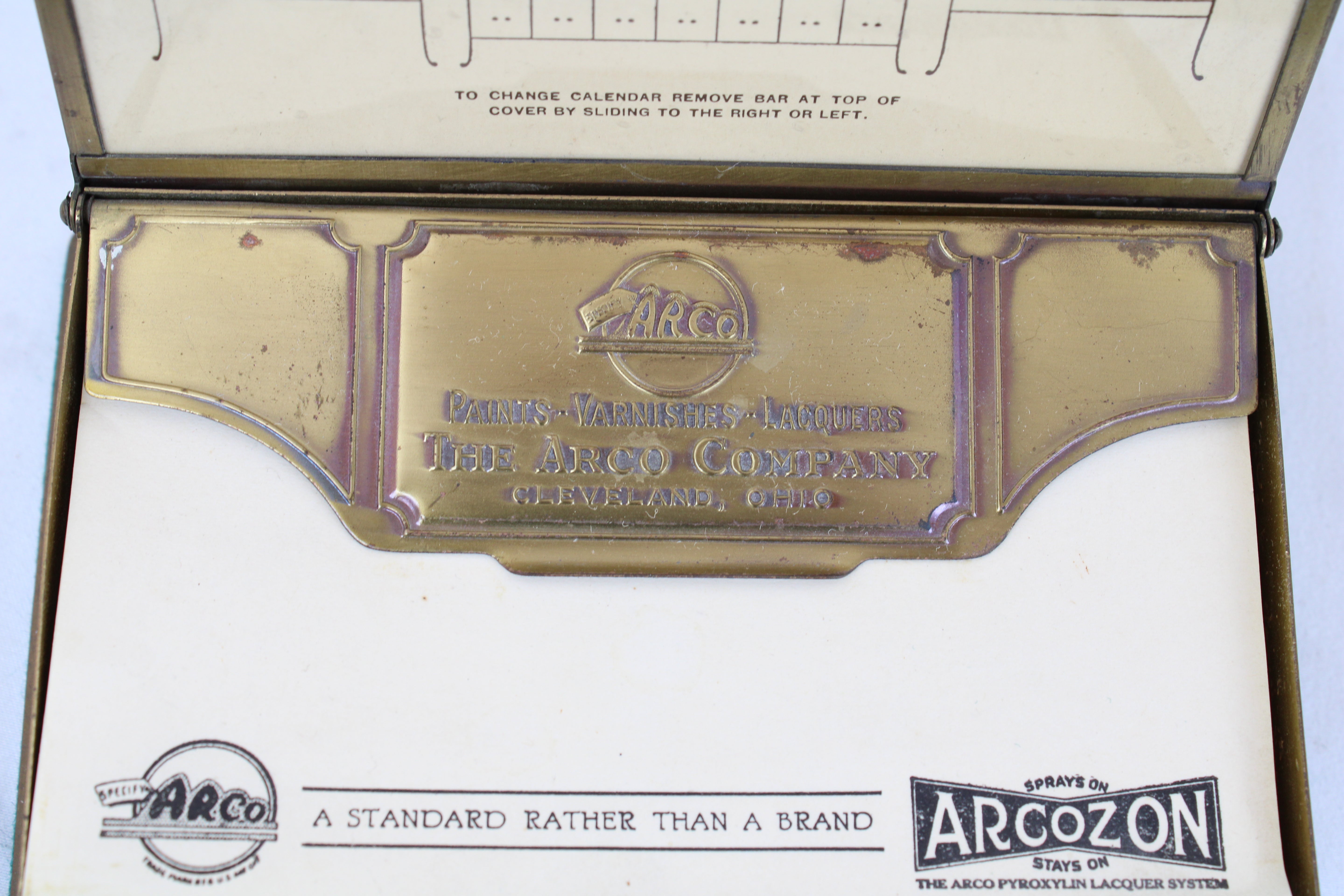 This rare brass desktop calendar, loaded with original 3" x 5" memo paper, is embossed on the cover and interior note holder clip with the name "The Arco Company - Cleveland, Ohio" and the words "Paints, Varnishes & Lacquer's" above the name.