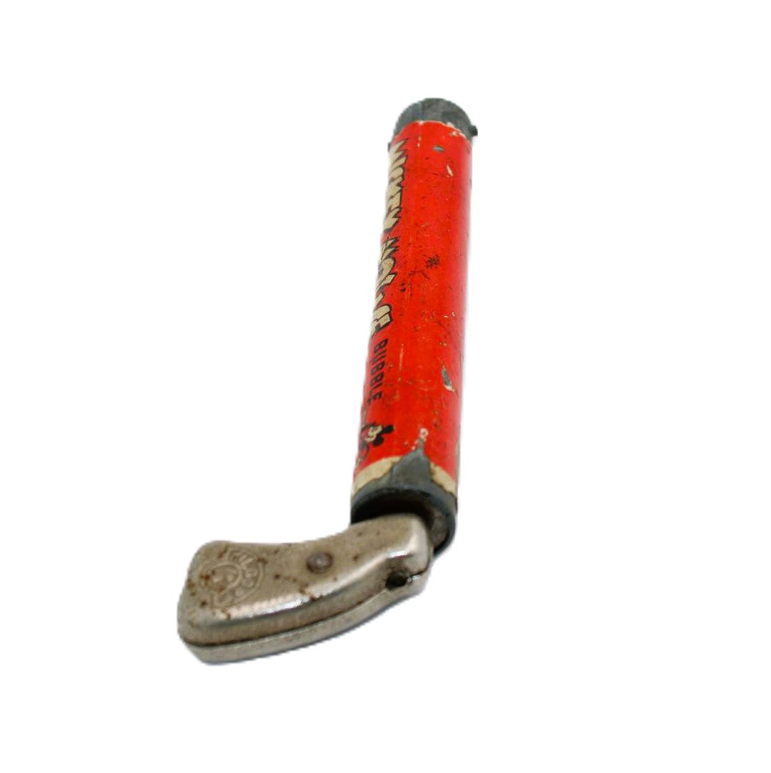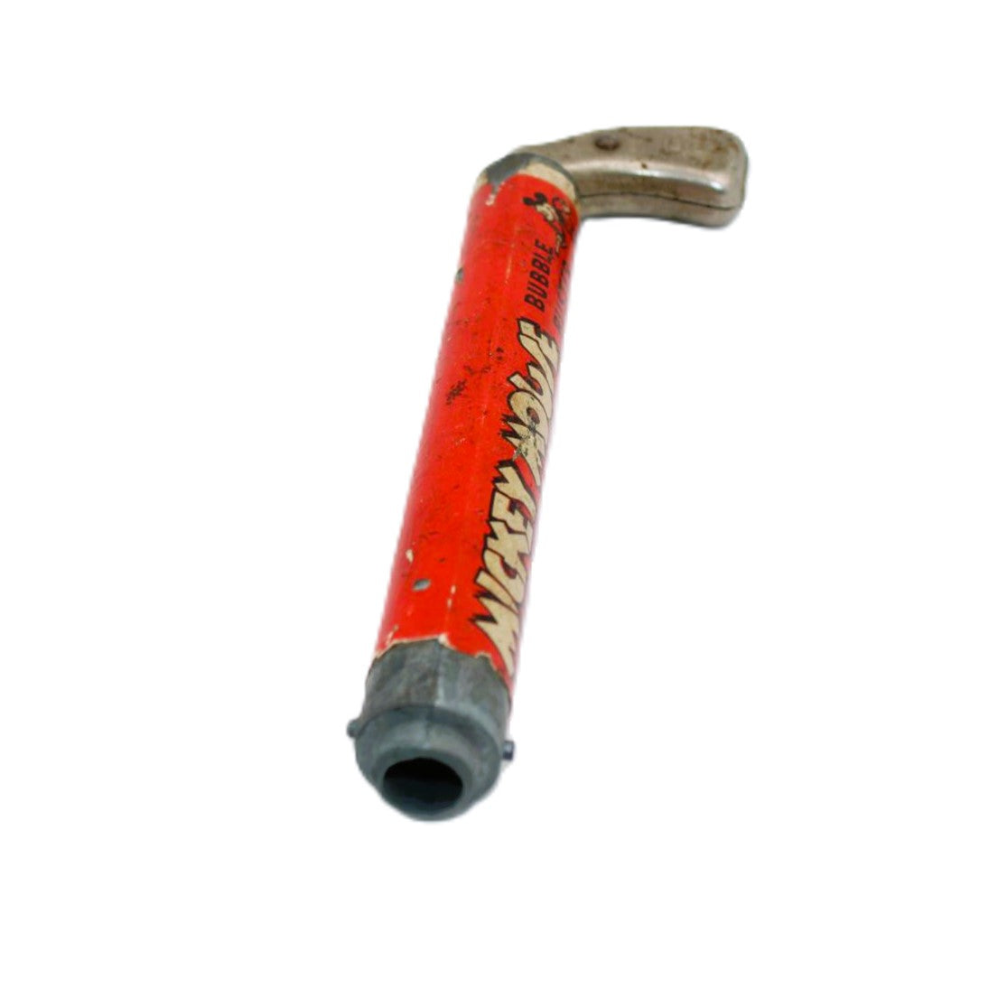 This item is in good to fair condition with some soiling, scratches, and tearing on the red label wrapped around the barrel and some pitting on the metal. The plunger mechanism appears to be working fine and the gun handle is in good shape. These bubble busters are becoming very rare.