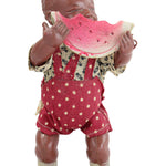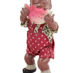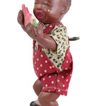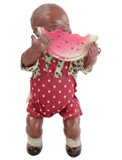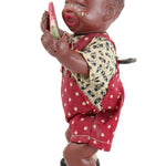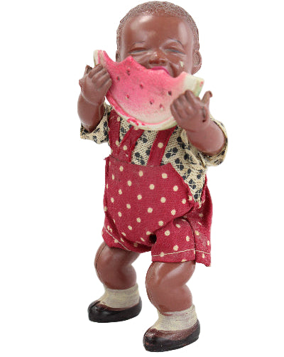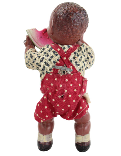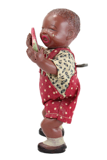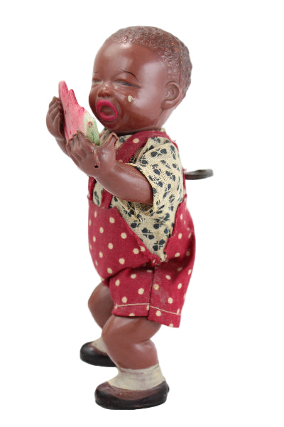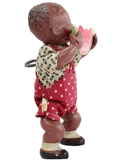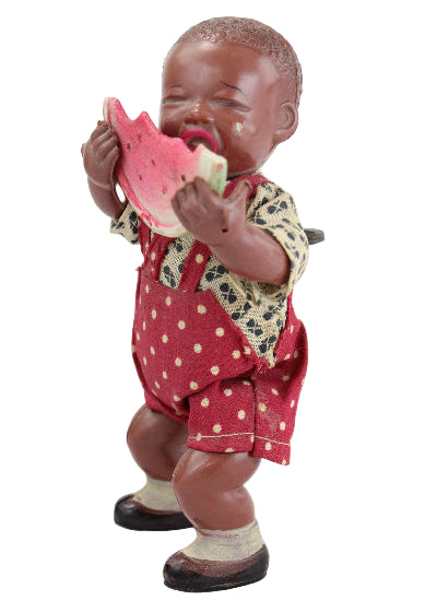 This highly collectible 6" tall wind-up depicts a little Black boy eating a slice of watermelon.