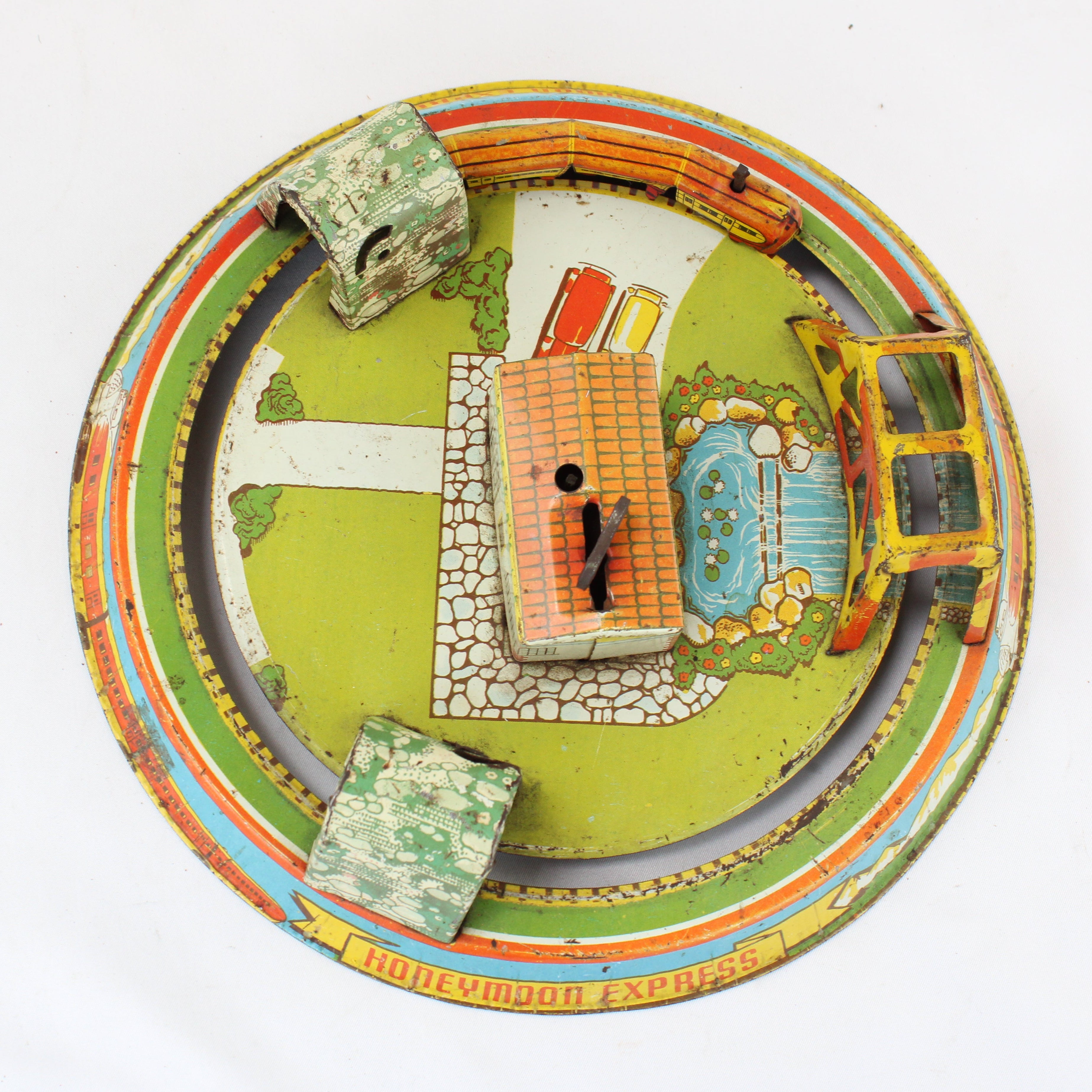 This model toy once had an airplane that would spin around the train track when wound. The airplane is missing but the hole where the airplane wire would be inserted is still present and the gear mechanism appears to be rotating.