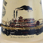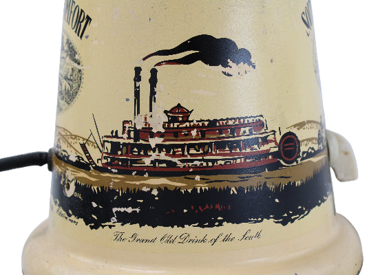 The Southern Comfort lithographed scene on the base features a black houseman serving a bearded plantation owner a drink while overlooking a scenic river valley with a steamboat displayed in the background.