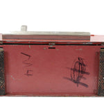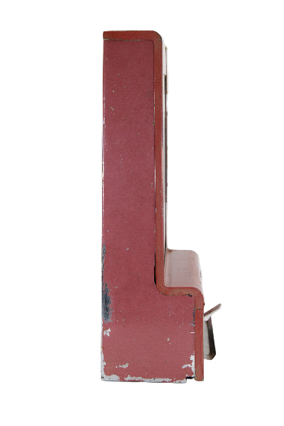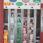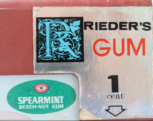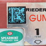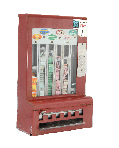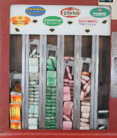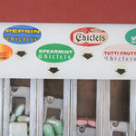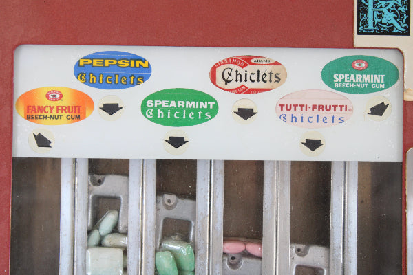 The red painted machine is 16" tall, 9-7/8" wide, and under 5" in depth. The machine still has old gum (would not chew today) in each slot, including Beech-Nut Fancy Fruit and Spearmint and Chiclet flavors of Pepsin, Spearmint, Cinnamon, and Tutti-Fruiti.