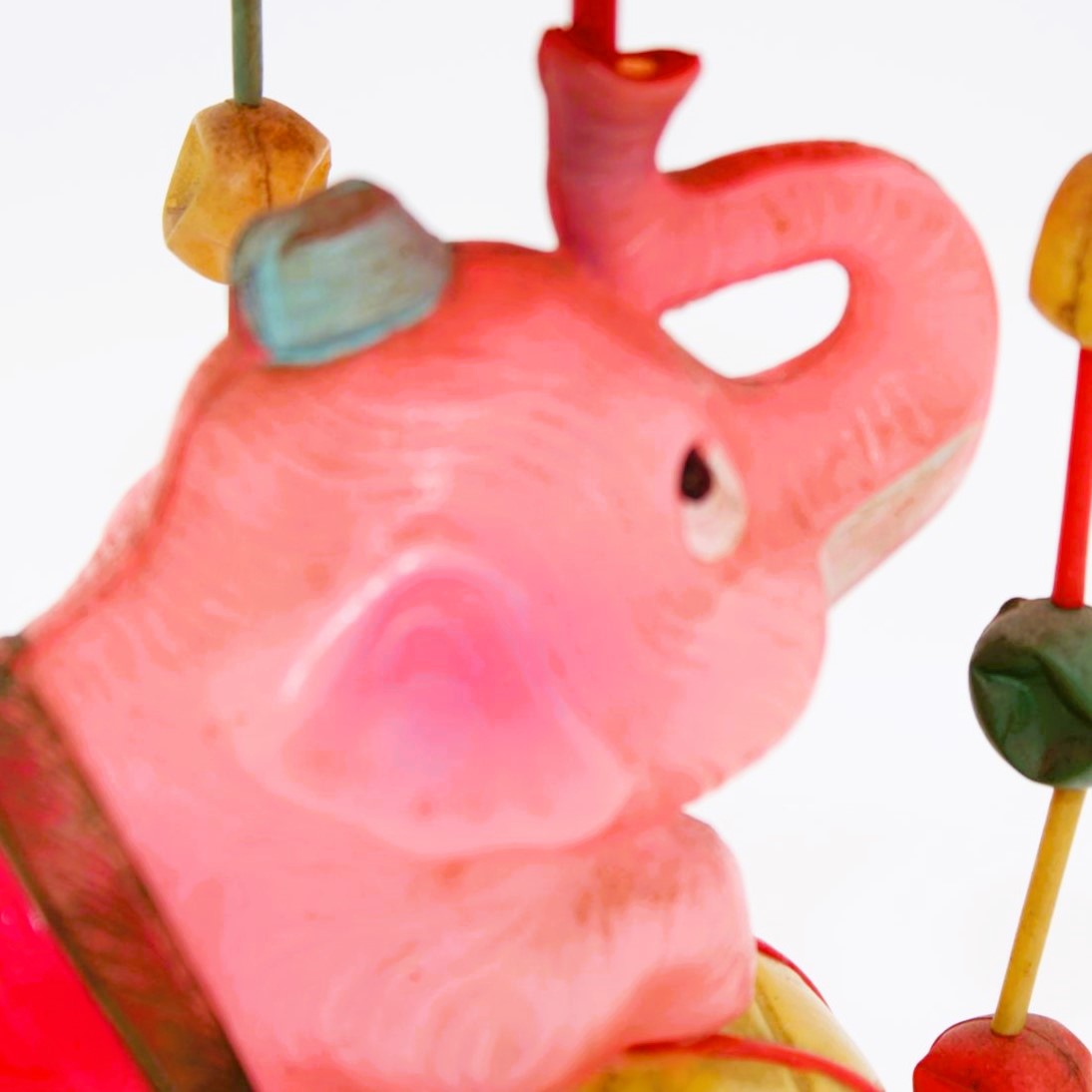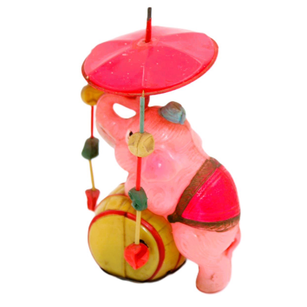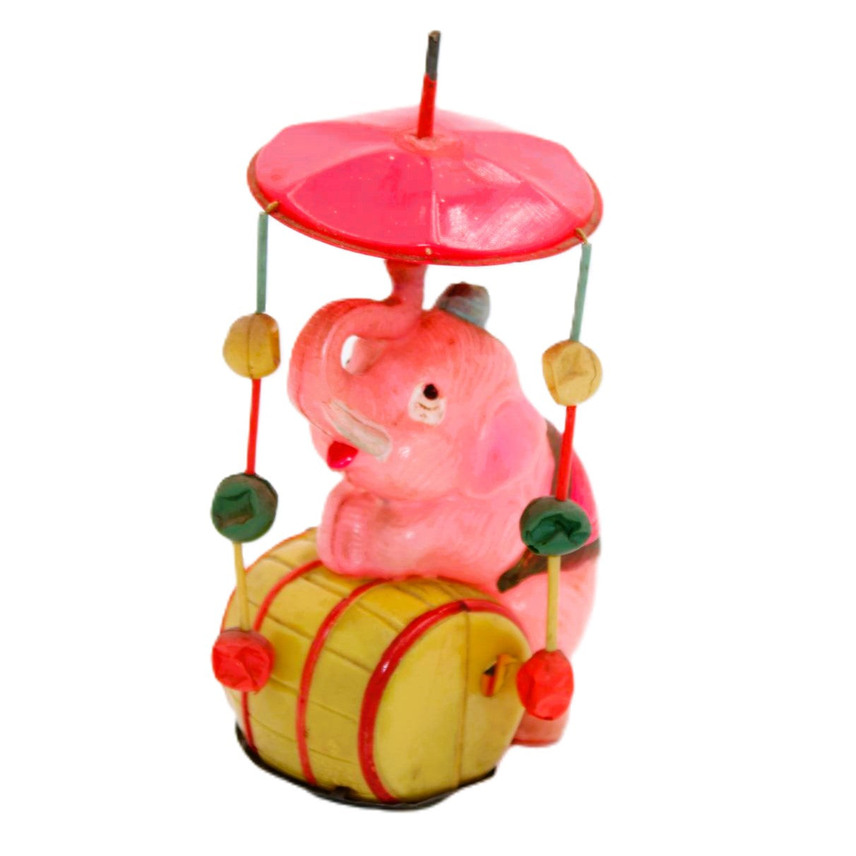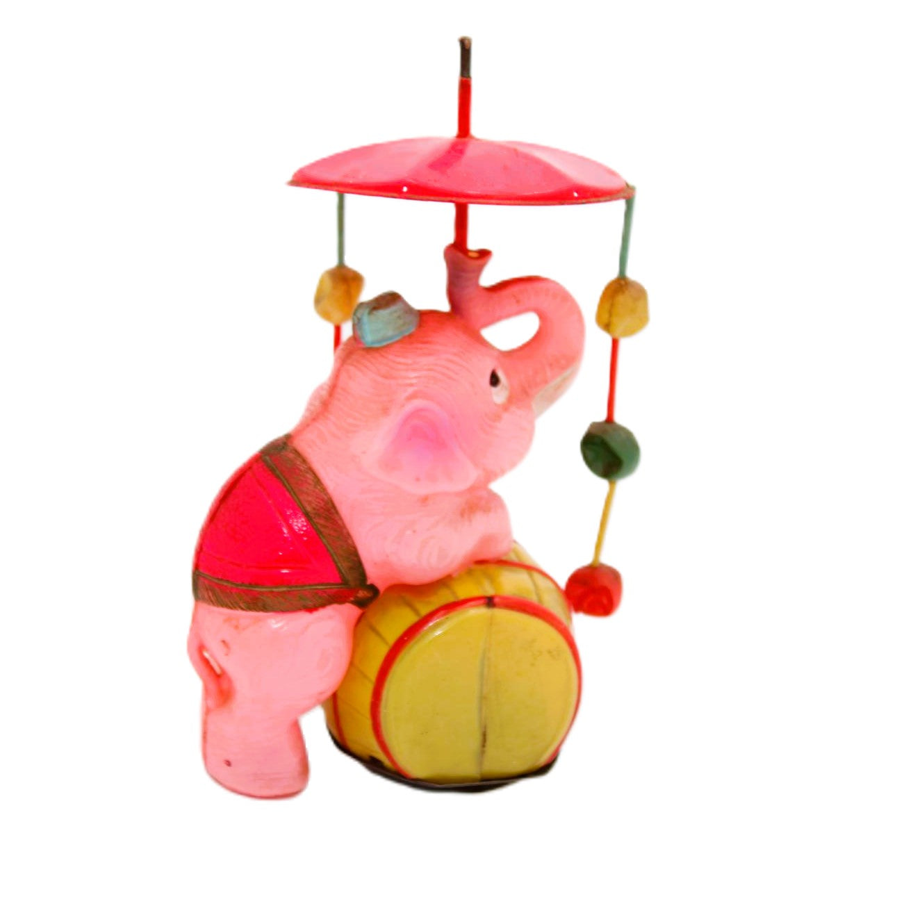 The wheels on the rear legs of the elephant are working as are the two barrel wheels. The elephant originally came with six strands of beads but only two remain. The condition of the plastic is very good with no tears or breaks. A very good Japanese shelf piece for a cheap price.