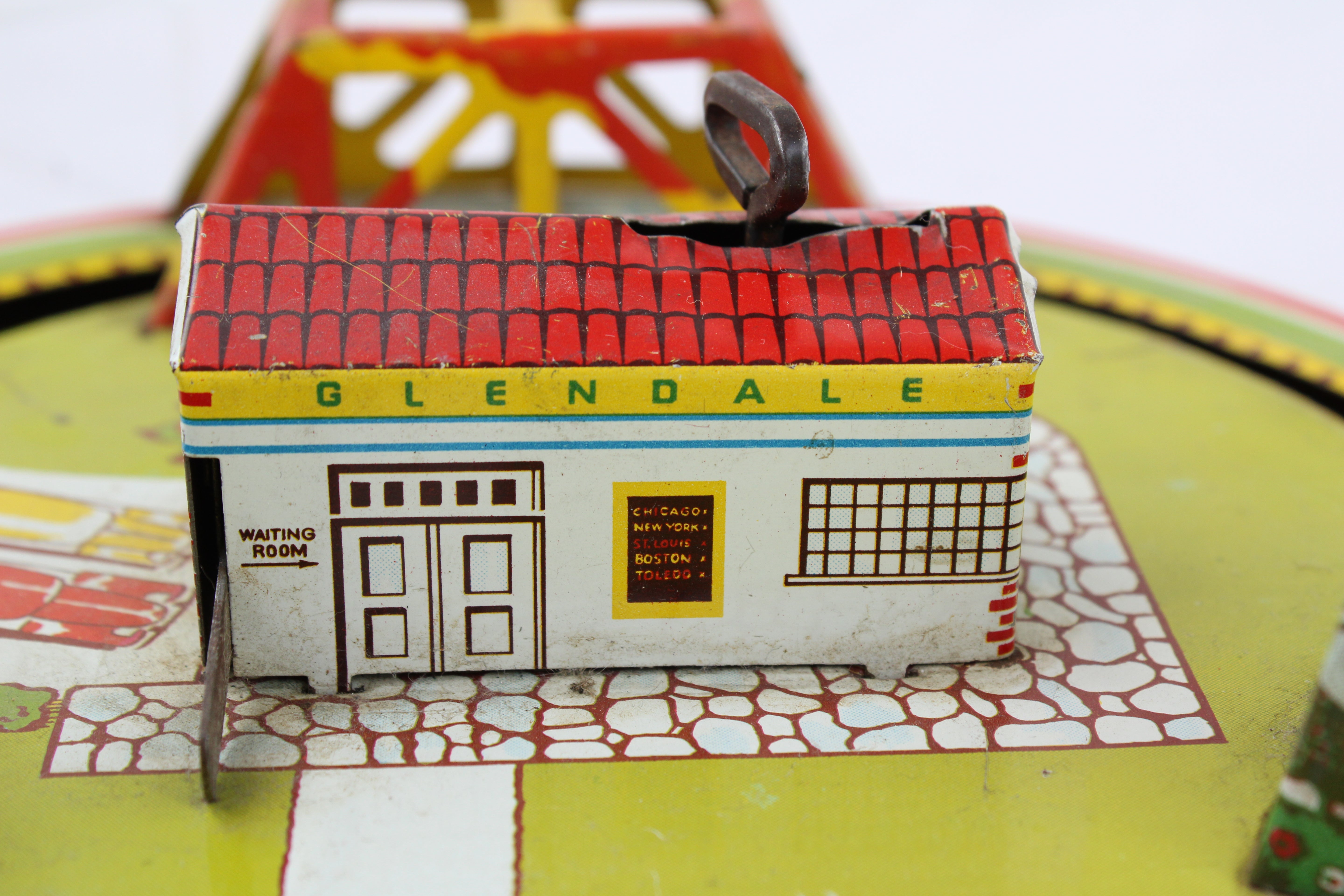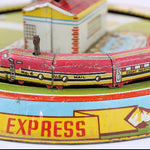 There is very little oxidation on this toy and the tin shows minimal scratching. The sliding on/off switch located on the depot building works.
