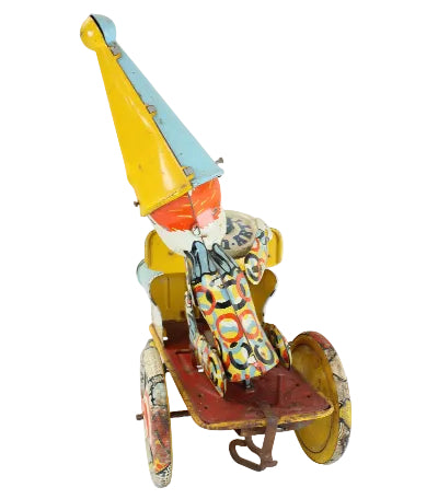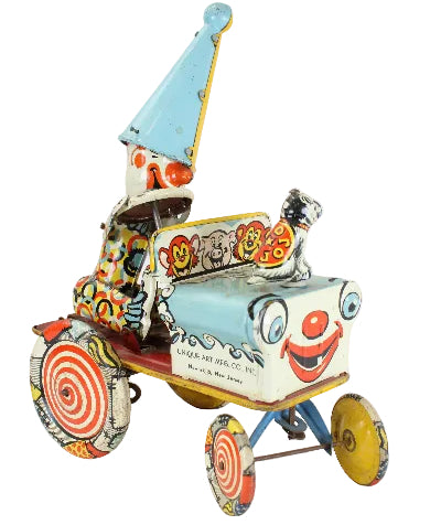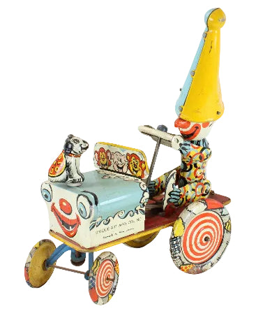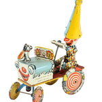 This 7" long and 9-1/2" tall tin-litho clown car worked very well when tested.