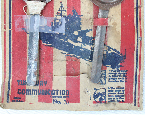 The toy has rested on the original 9" x 7" battleship scene card for over eighty years. The two simple toy microphones have some oxidation, but this should be easy to remove with metal cleaner.