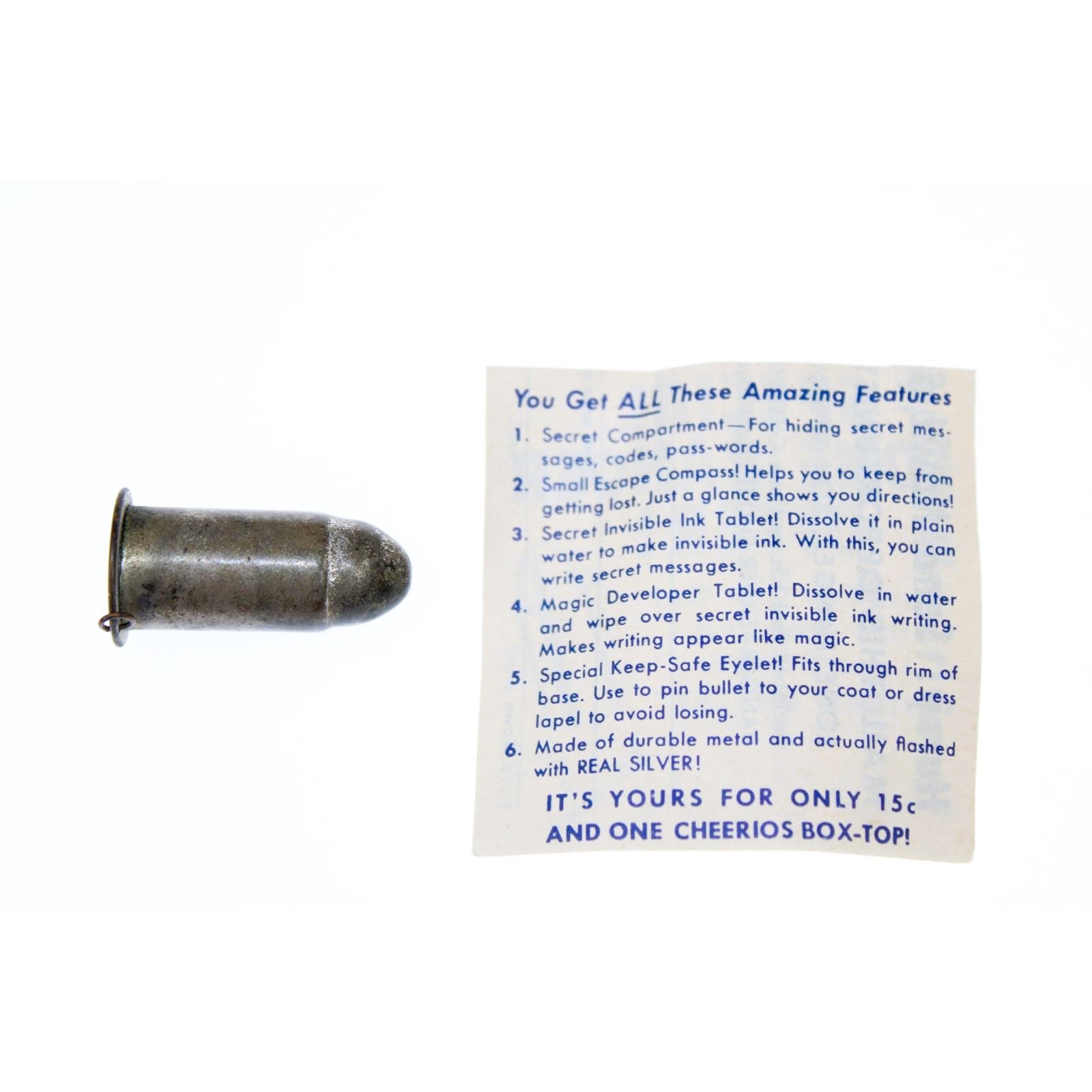 The bullet's bottom has the name Lone Ranger etched on it. A secret compartment and a small compass were built into the bullet. The offer also included an invisible ink tablet and magic ink developer to send and receive secret messages.