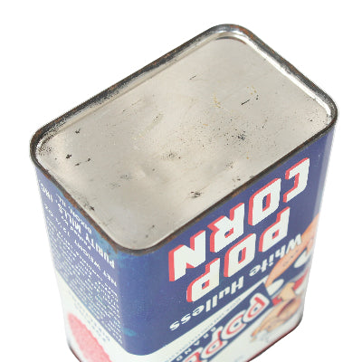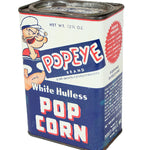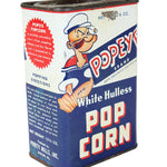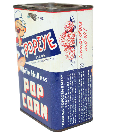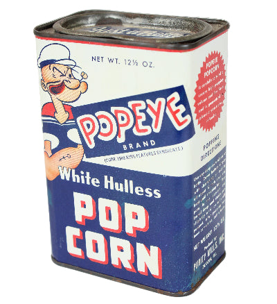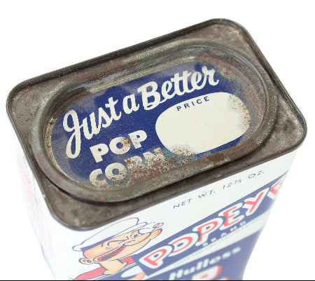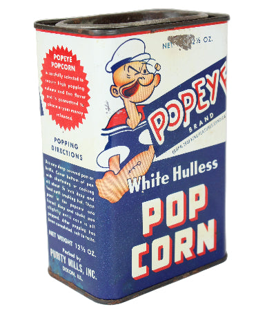 This 12.5 oz rectangular tin of Popeye-brand popcorn kernels was made by Purity Mills of Dixon, IL.