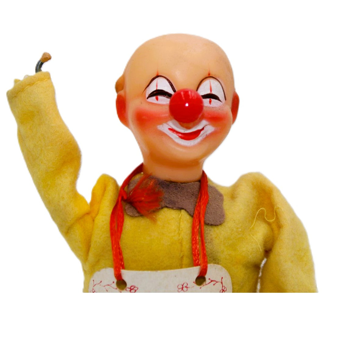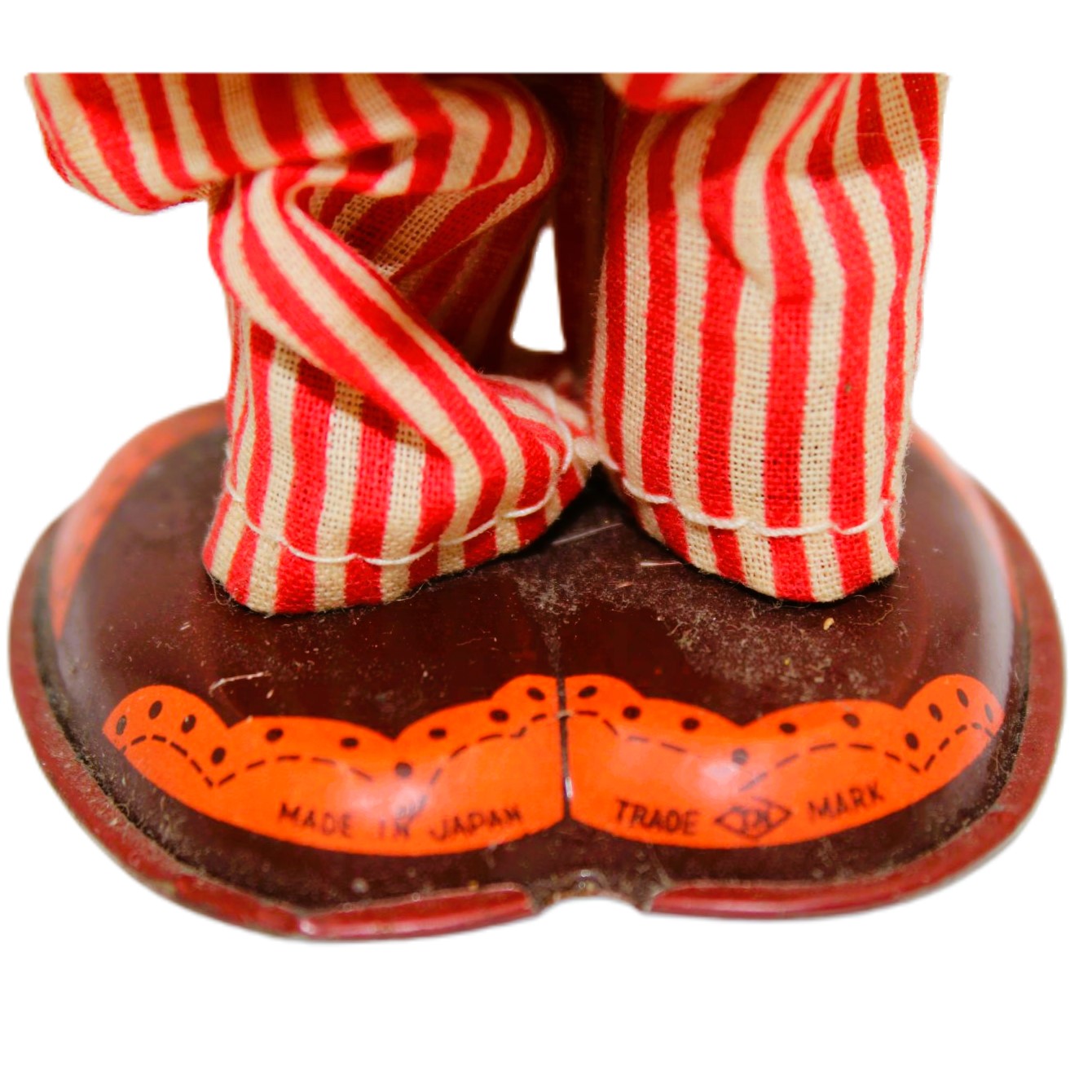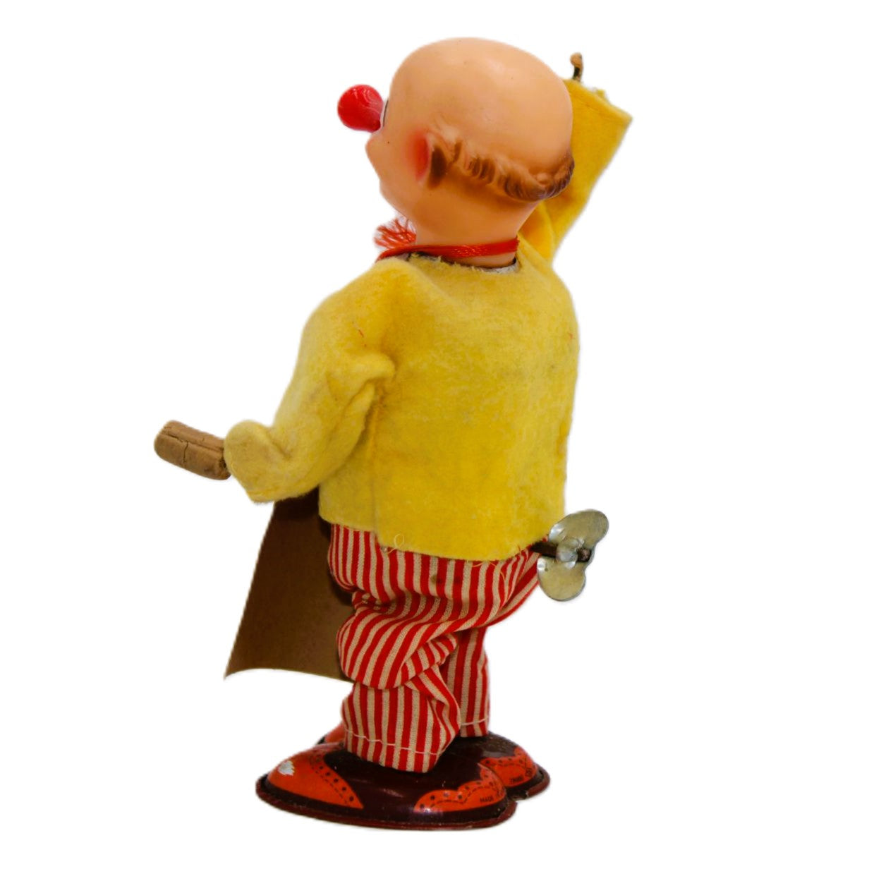 This Japanese litho toy can no longer wind his way down the road. The toys clothing, sandwich sign, face, and tin feet are still in very good condition. The small metal cane and red hat are missing as well.