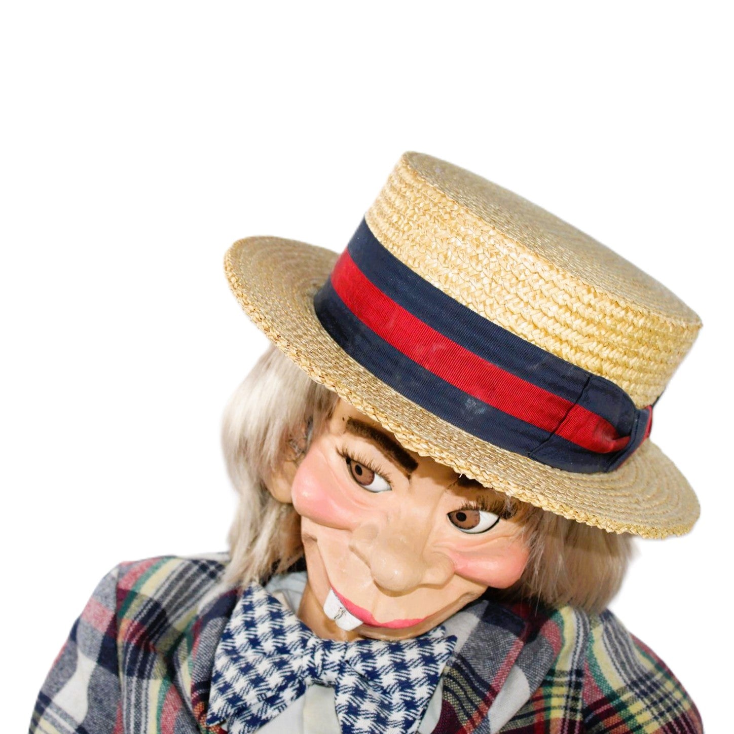 This is a very real Mortimer Snerd custom-manufactured ventriloquist dummy that appears to be identical to the one Edgar Bergen would use.  The vintage clothing, bow tie, shoes, Ponti Rialto straw hat, and even the old vintage Timex watch on Mortimer’s wrist all points to its use by a Professional ventriloquist.