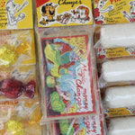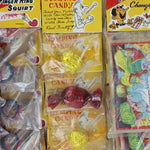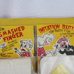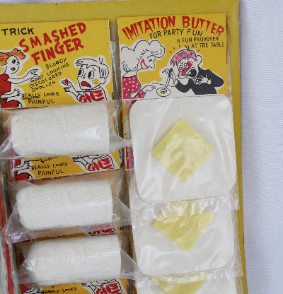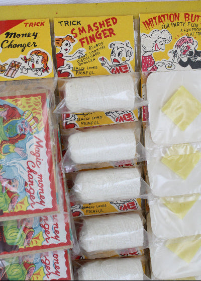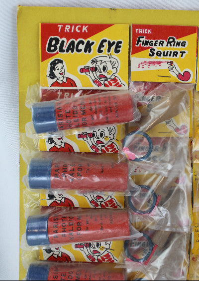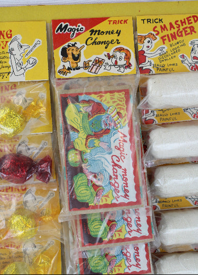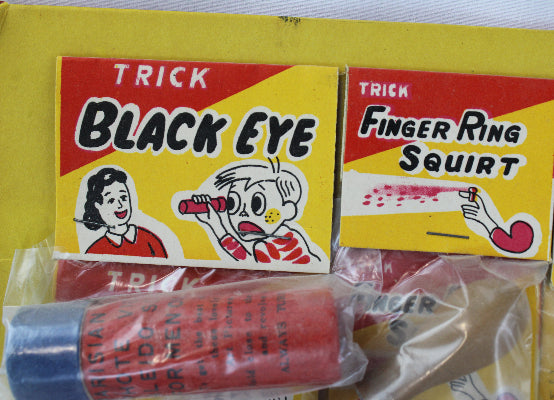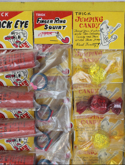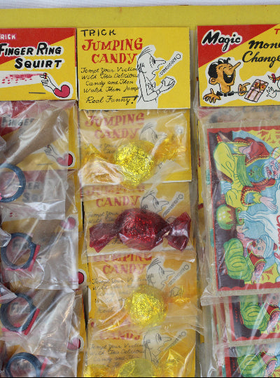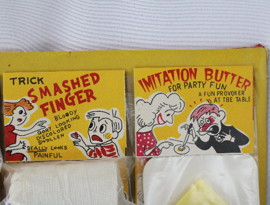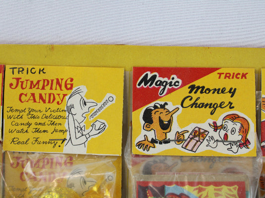 This vintage display card measures 14" tall and 15" in width. The hanging display includes six trick novelties of six each (36 tricks), including black eye, finger ring squirt, jumping candy, money changer, smashed finger, and imitation butter.