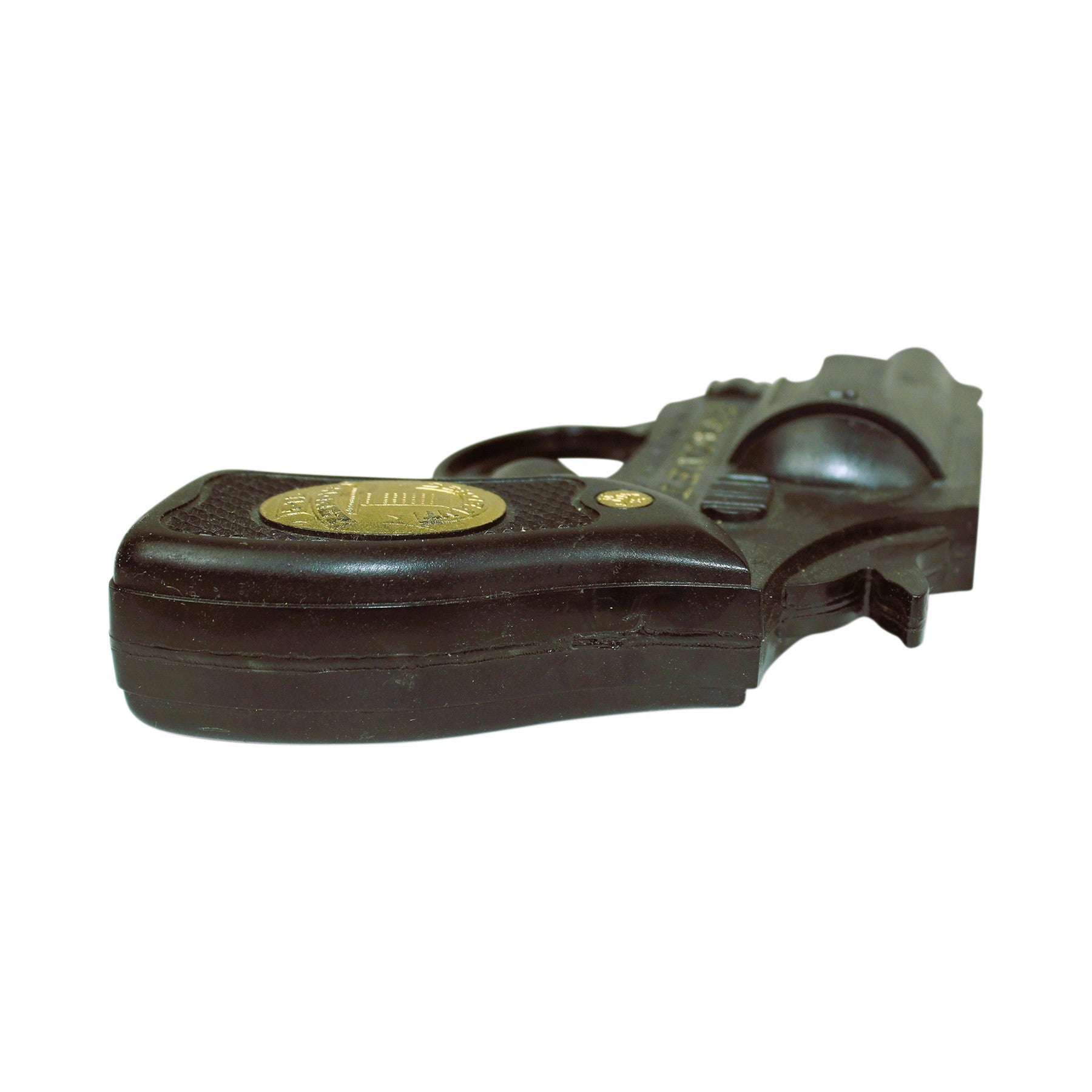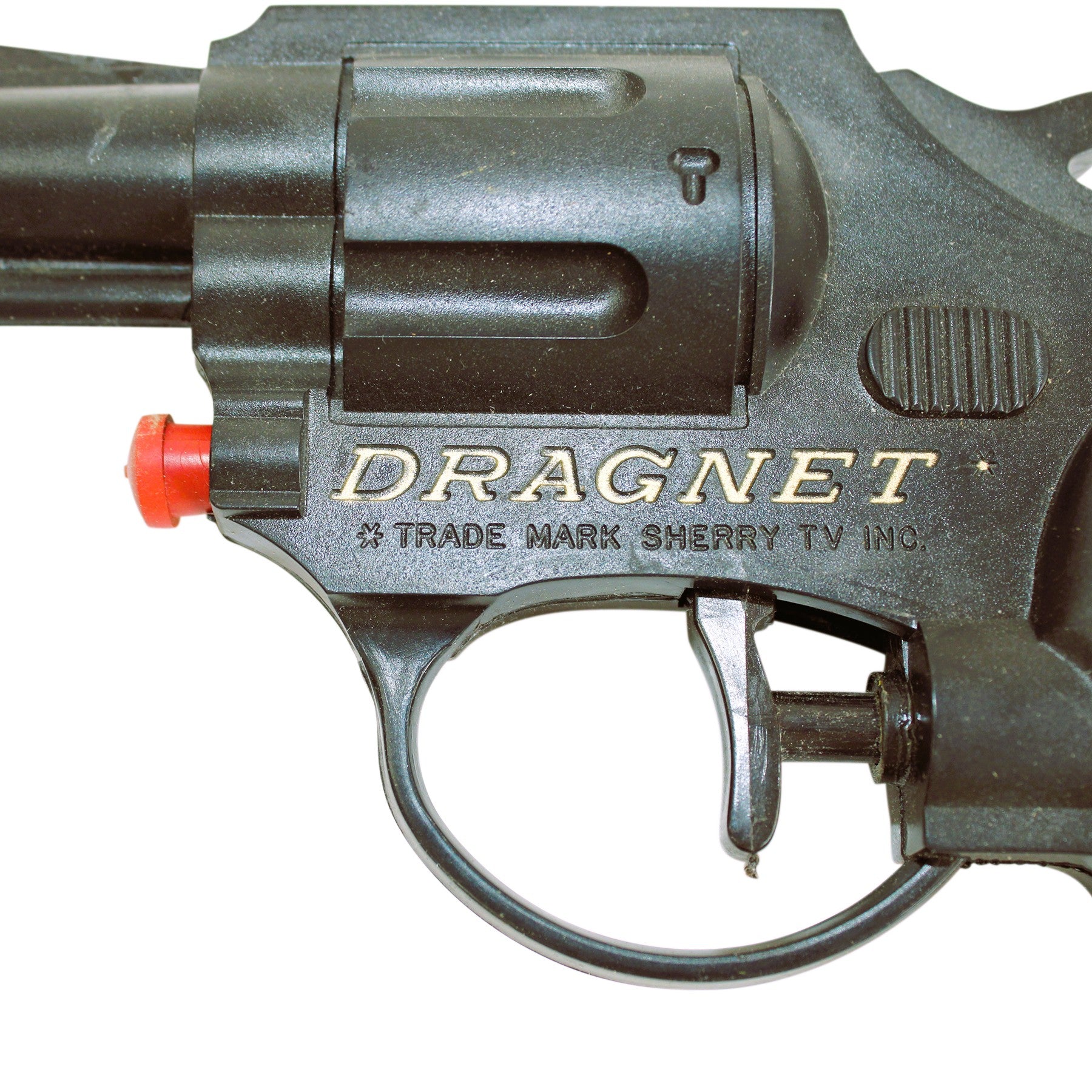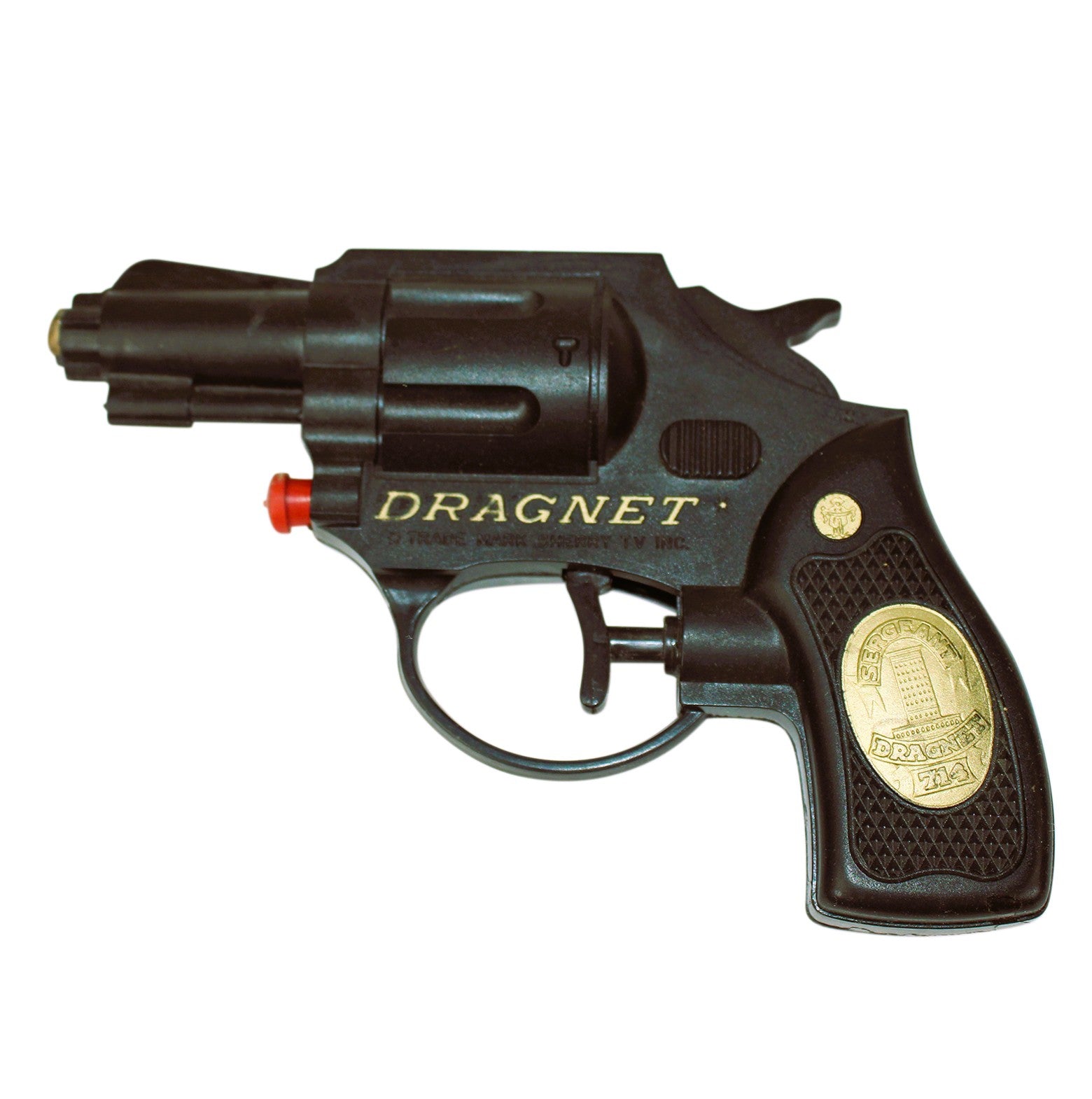 This 6" long black plastic water pistol has gold accents above the trigger guard embossed with the words "Dragnet."