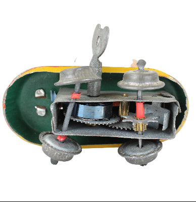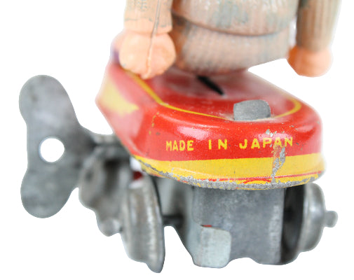 This 3" long and 3-1/2" tall wind-up features a celluloid child sitting on a cart that looks somewhat like a skateboard with a handle.