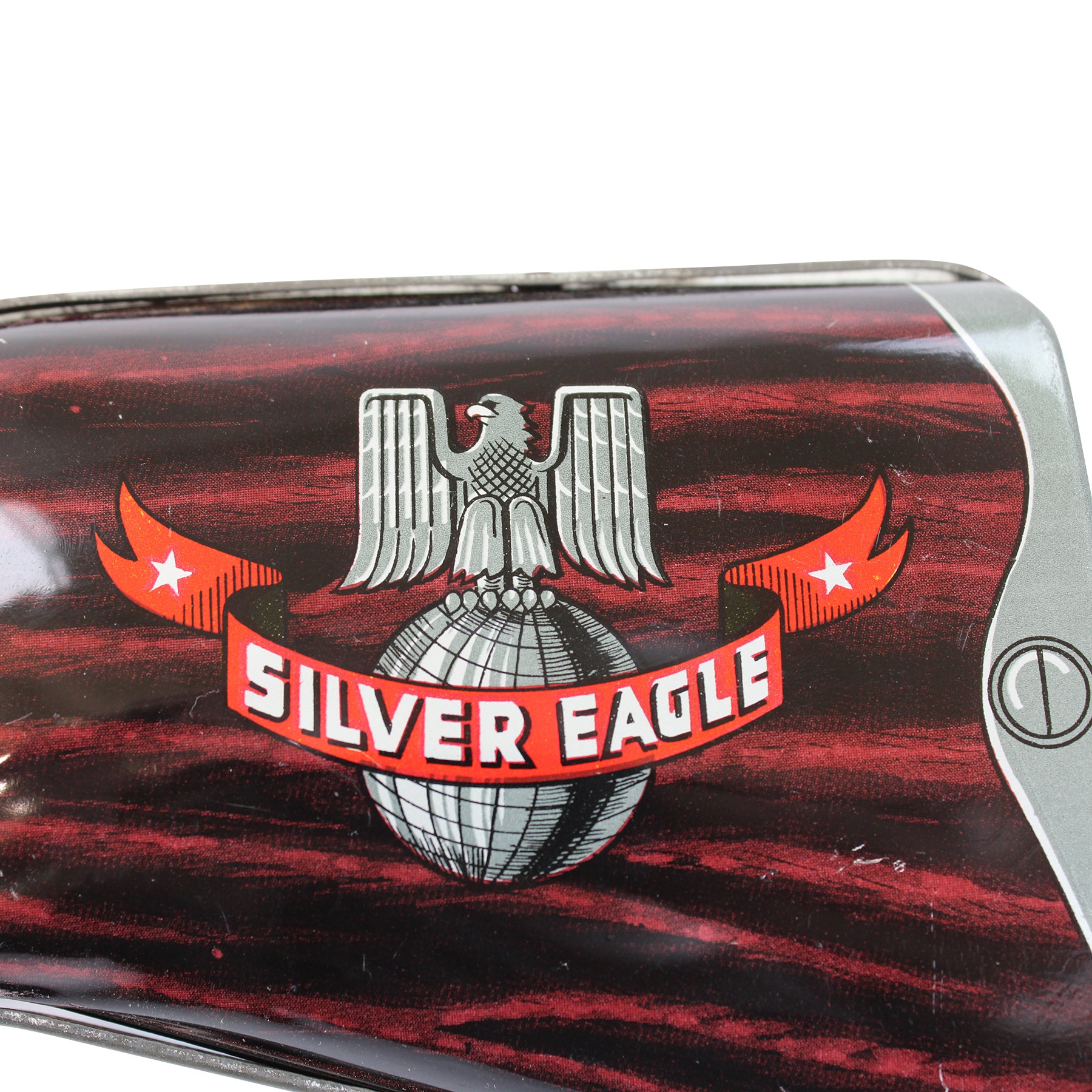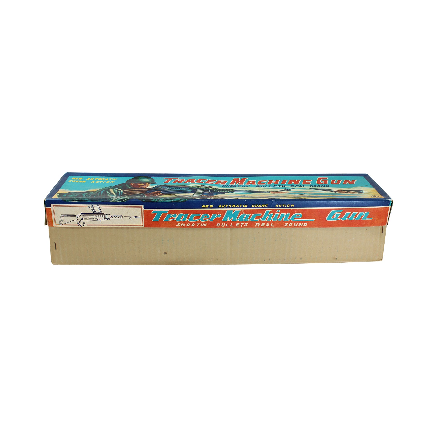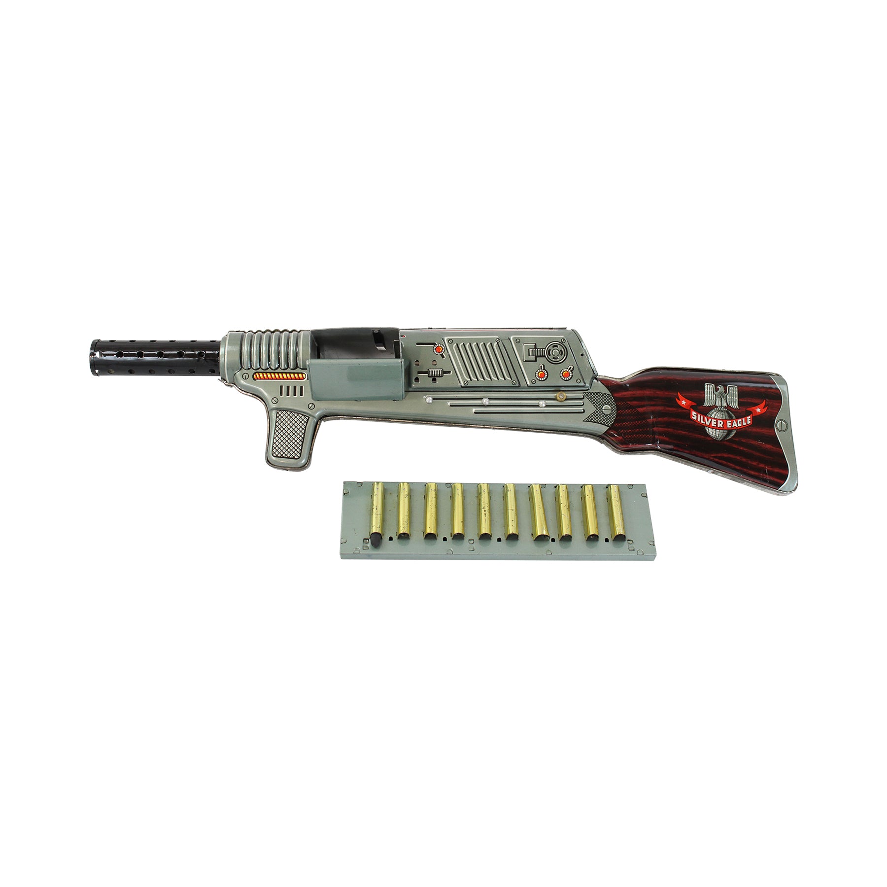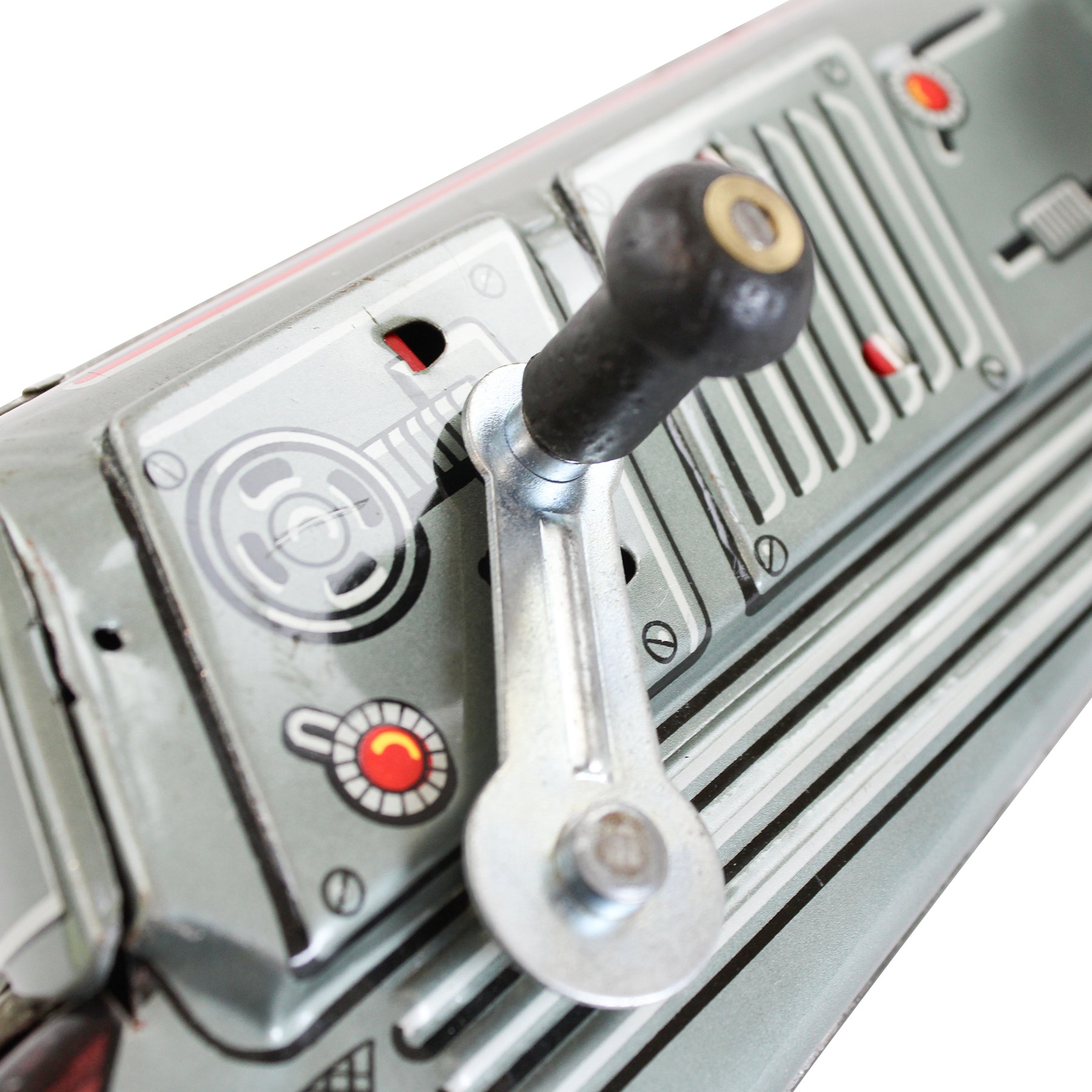 This Japanese-made classic metal gun has the crank-action handle. The gun is approximately 21" long and is in very good to excellent condition with no damage on the highly detailed metal with the exception of some oxidation on the bright metal joining strip resulting from age.