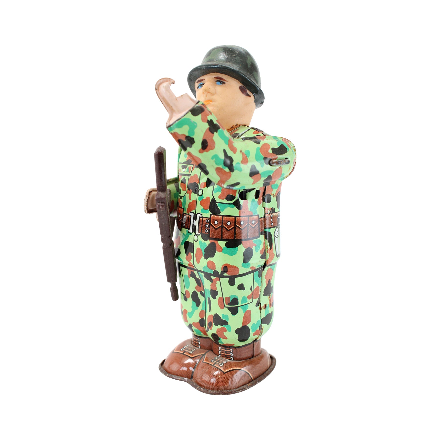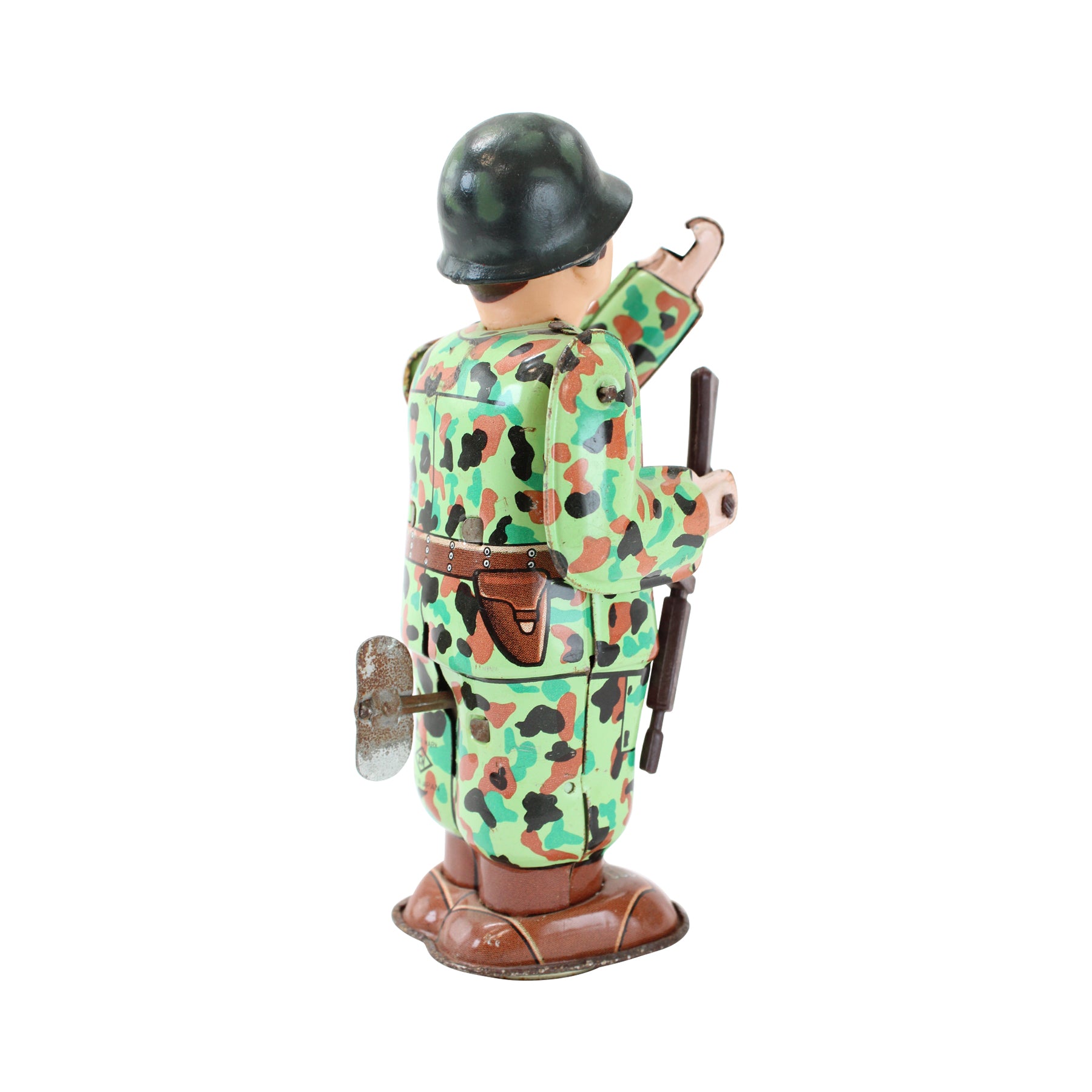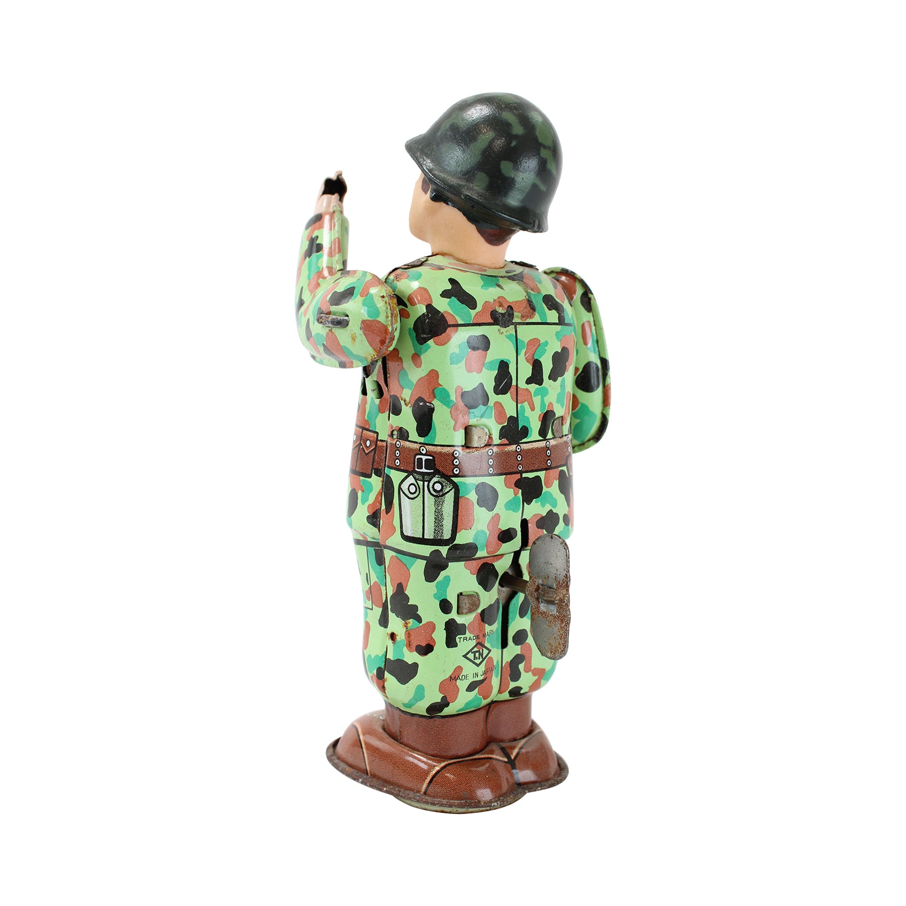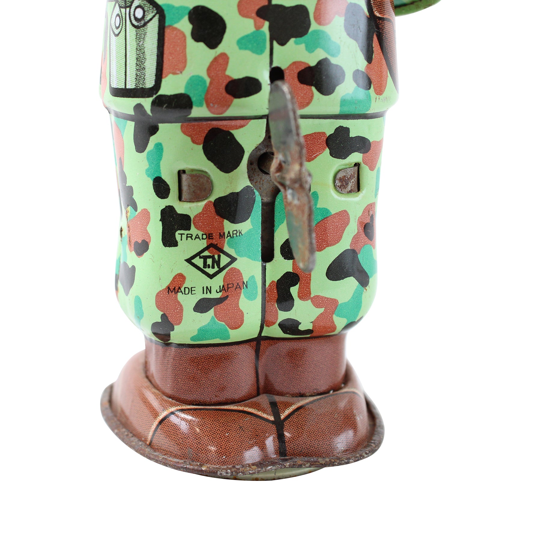 When wound, the arms move up and down, the soldier spins in circles, and gun clicking sounds are made. This Japanese tin should be highly collectible.