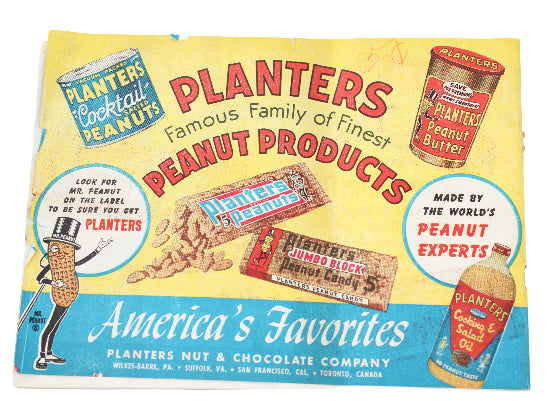 The booklet also served as a coloring book where children could copy and paint the illustrated pictures in the book. The back page features a vintage ad for the products produced by Planters Nut & Chocolate Company.