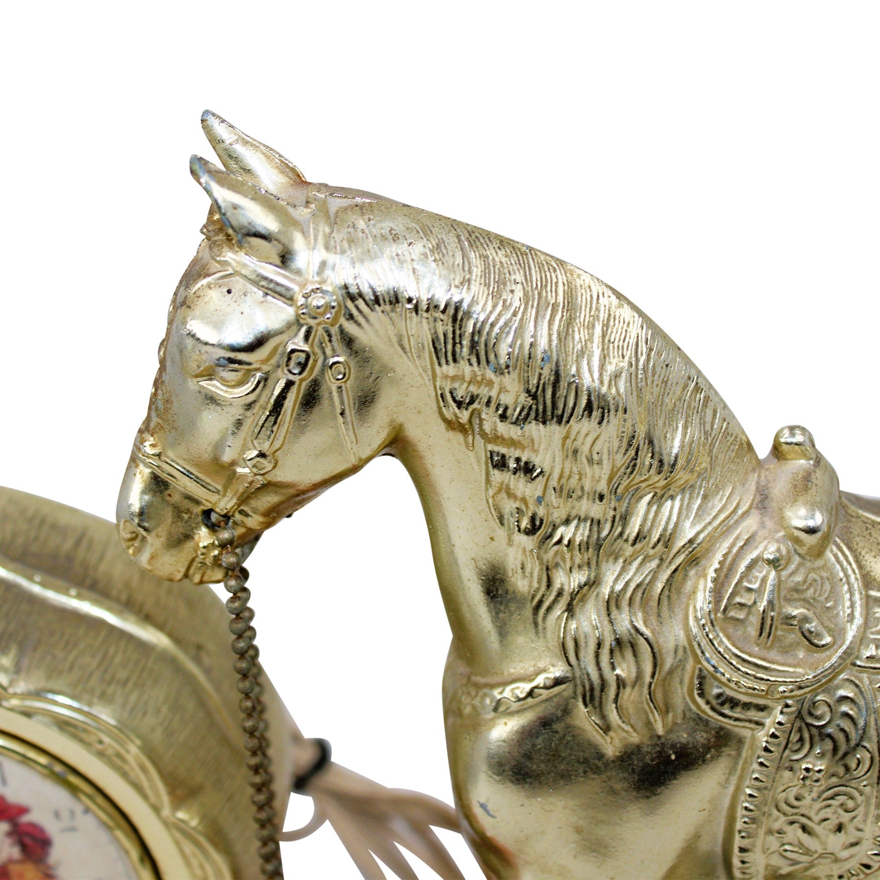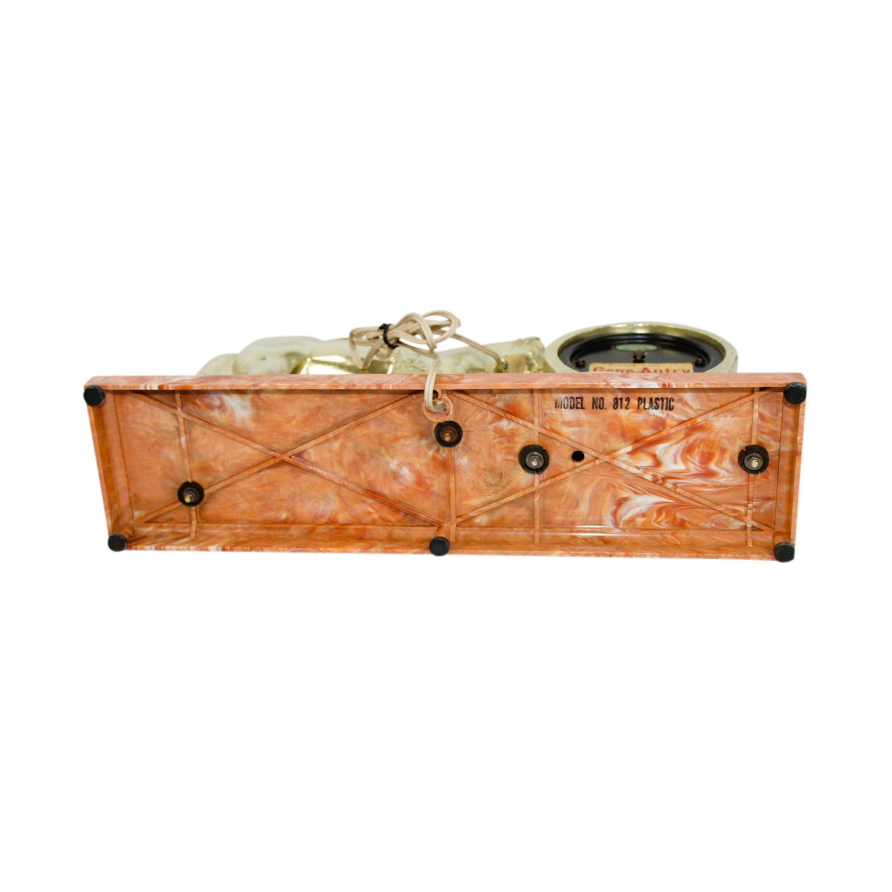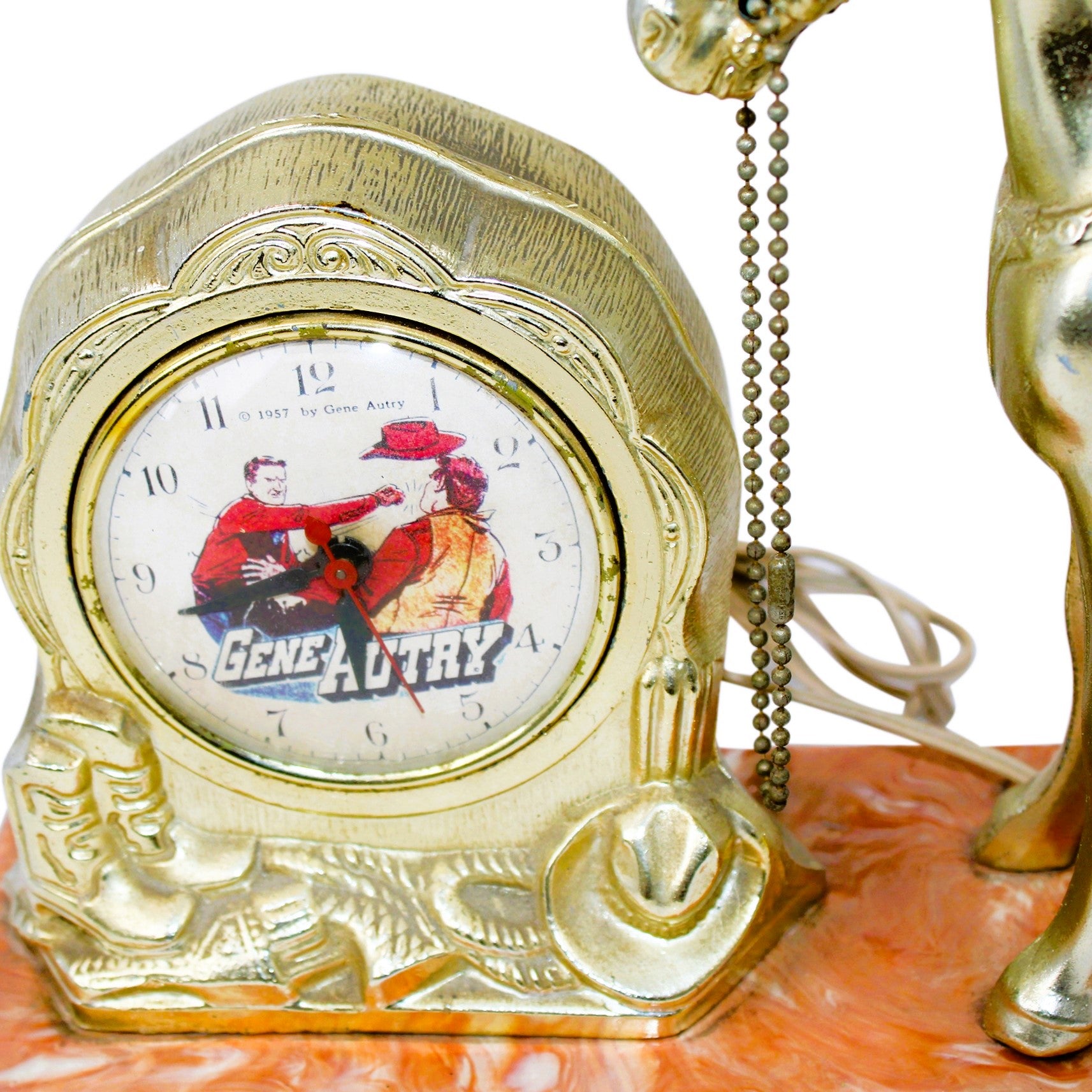 This working clock displaying Gene Autry, the Singing Cowboy, slugging a bad guy is in excellent condition. This vintage clock and horse remain mounted on the original hard plastic platform.