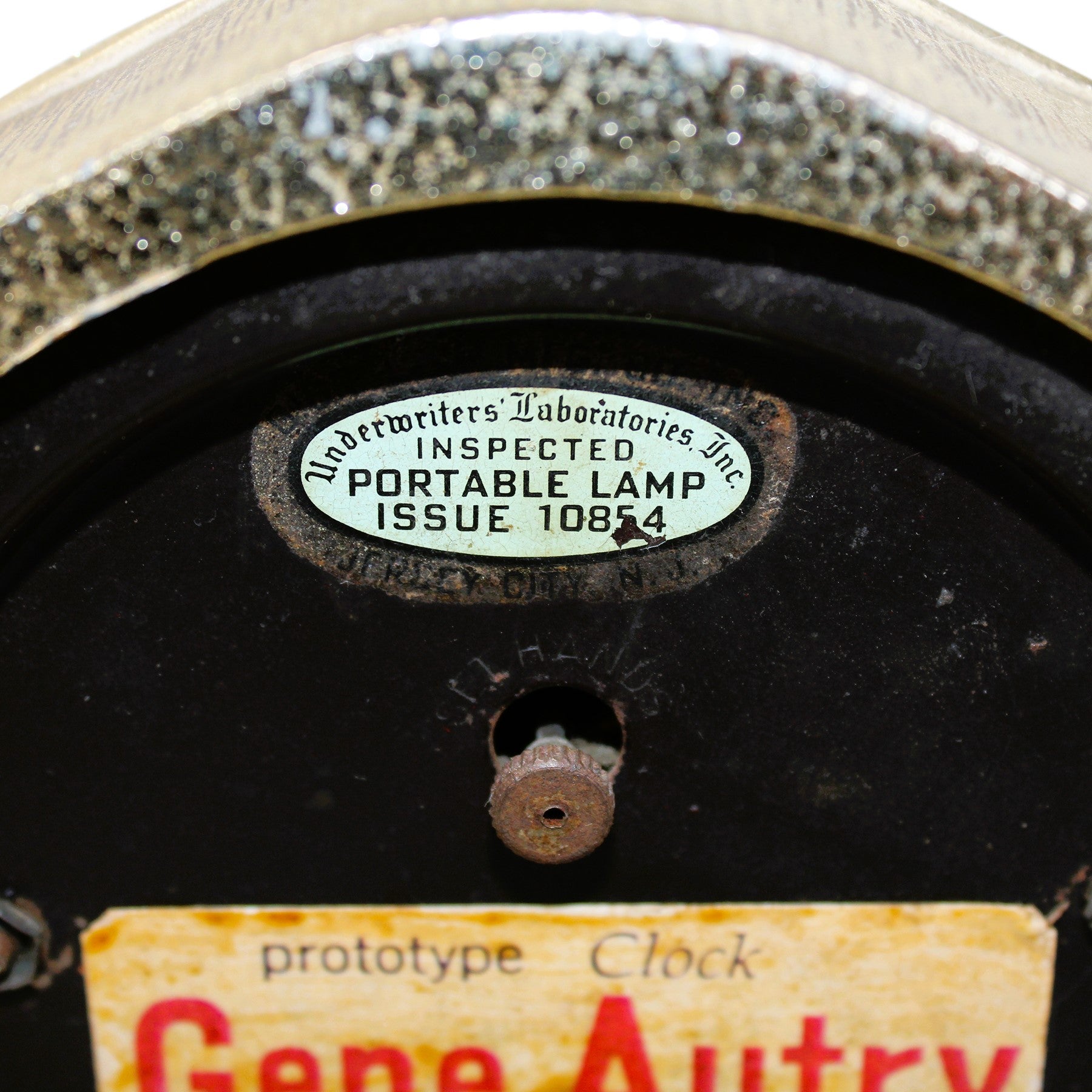 The platform measures 17” in length and 4 ½” in width and the highest point of the horse is 11” tall. The original sticker on the back of the clock has written “Gene Autry Prototype Clock.”