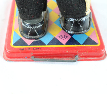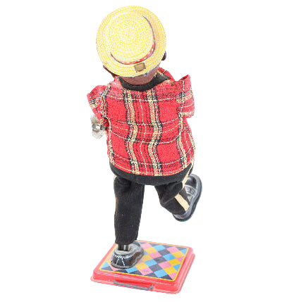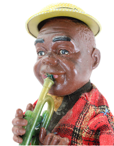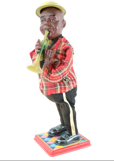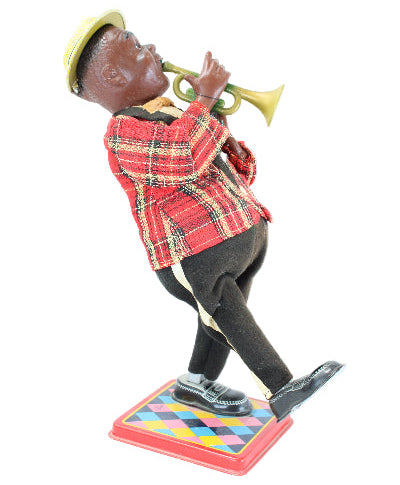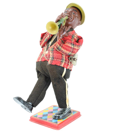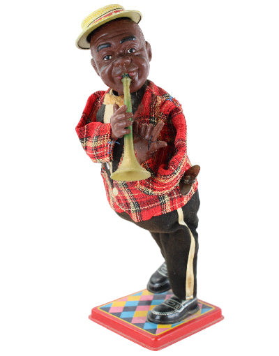 Satchmo plays his trumpet when the toy is wound as he moves back and forth on his right leg, while he moves his hands and head as he flips his metal hat. The winding mechanism worked when tested, but if the tension is too tight, some manual movement of his arm is required to get the mechanical action started again.