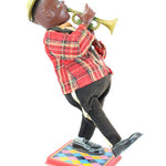 His bright jacket, bow tie, pants, and shoes show well. His hand and face are made of vinyl, the trumpet is plastic, with his hat and legs consisting of tin.