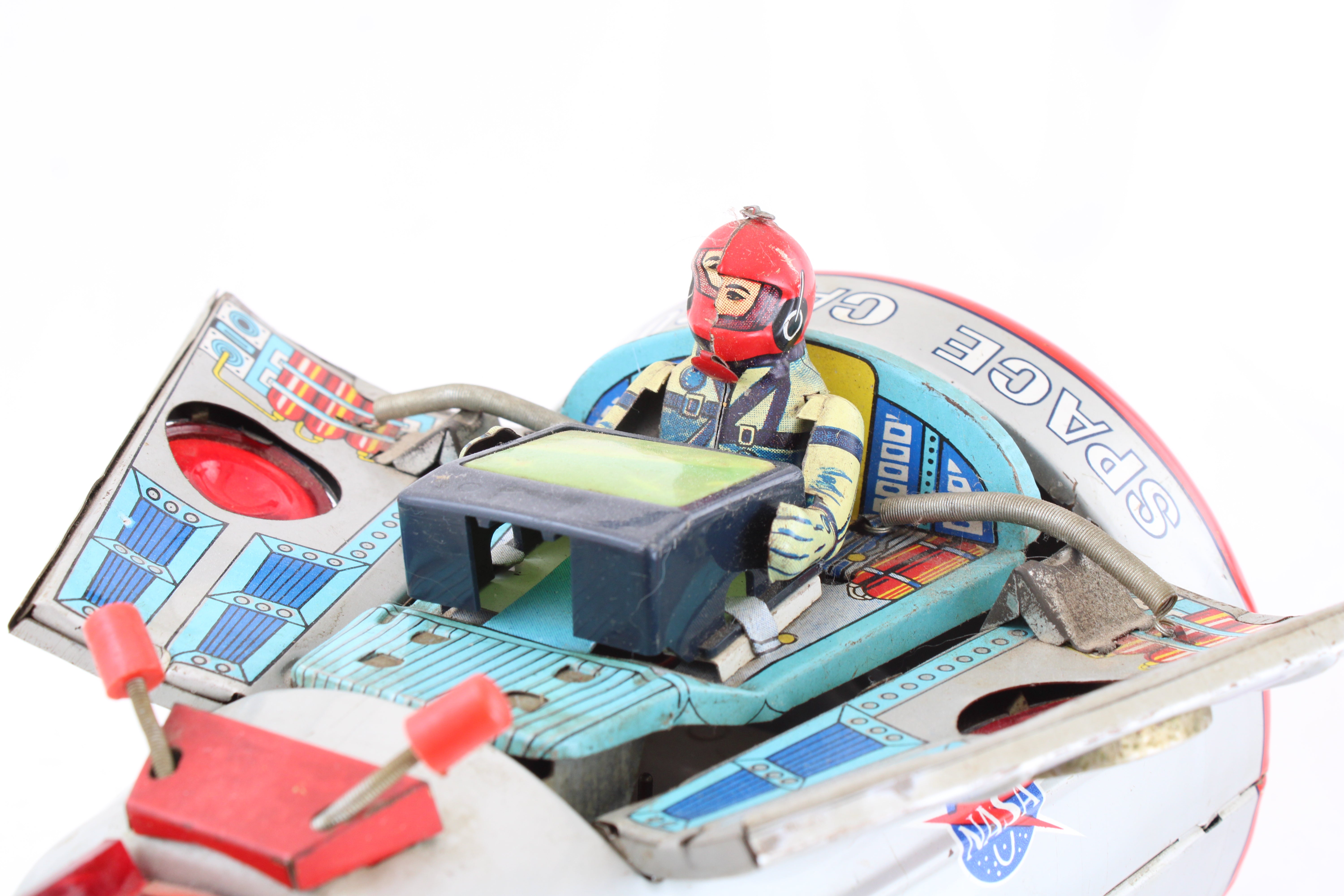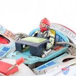 This detailed tin-litho toy, if working, would be moving around the floor while bumping, grinding, and reversing. Lights would appear in the capsule controller and nose cone, and the astronaut would pop up to take a picture as the doors open while some type of noise was emitted.