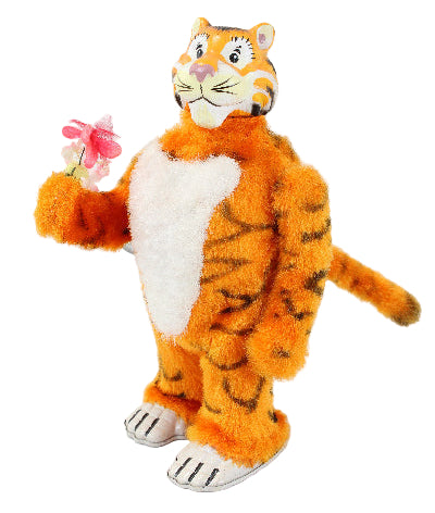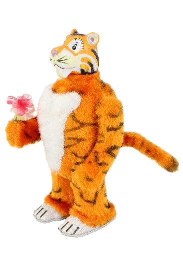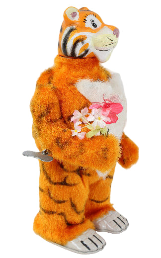 The wind-up mechanism worked well when tested. In one paw, there is a bouquet of flowers. It is believed this toy was manufactured to take advantage of the popular ESSO gasoline commercials that had the tiger mascot saying, "Put A Tiger In Your Tank."