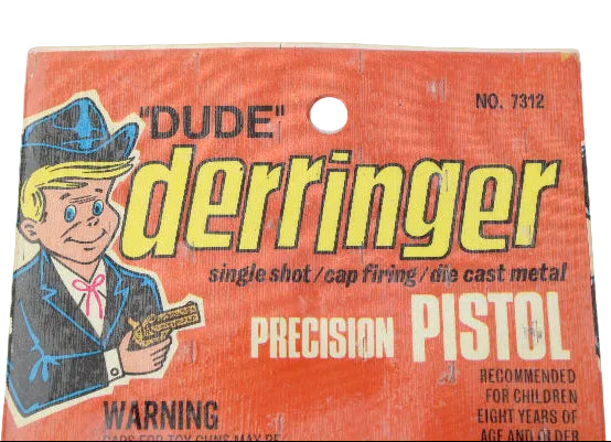 This unused 1974 Kilgore “Dude” Derringer cap pistol is a classic example of vintage American toy craftsmanship. Designed to fire precision plastic caps (still readily available online), it delivers the authentic sights and sounds that made cap pistols a childhood favorite.