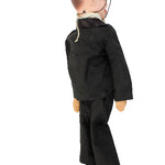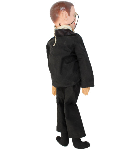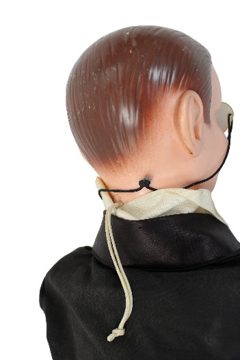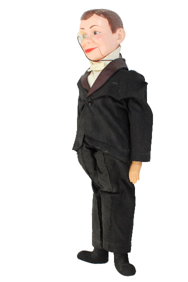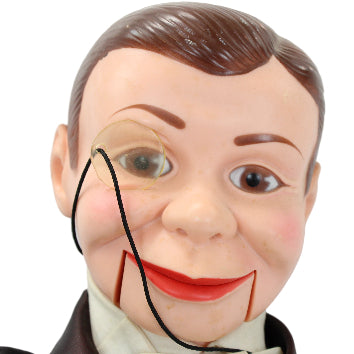 Charlie's monocle is attached to a cord. The tuxedo, head, hands, and stuffed cloth body are flawless. This is a great doll to learn hand-mouth control for ventriloquism because of the single string action that moves the doll's mouth.