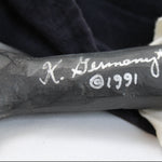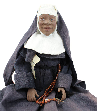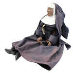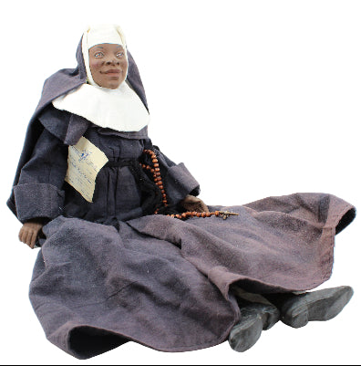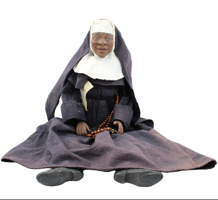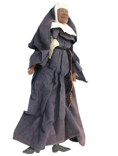The heavy blue denim clothing with white habit is exceptional. Mary Kathleen's wood beads with a cross are present, and her wood shoes are flawless with the authenticating signature of Karen Germany on the right leg.