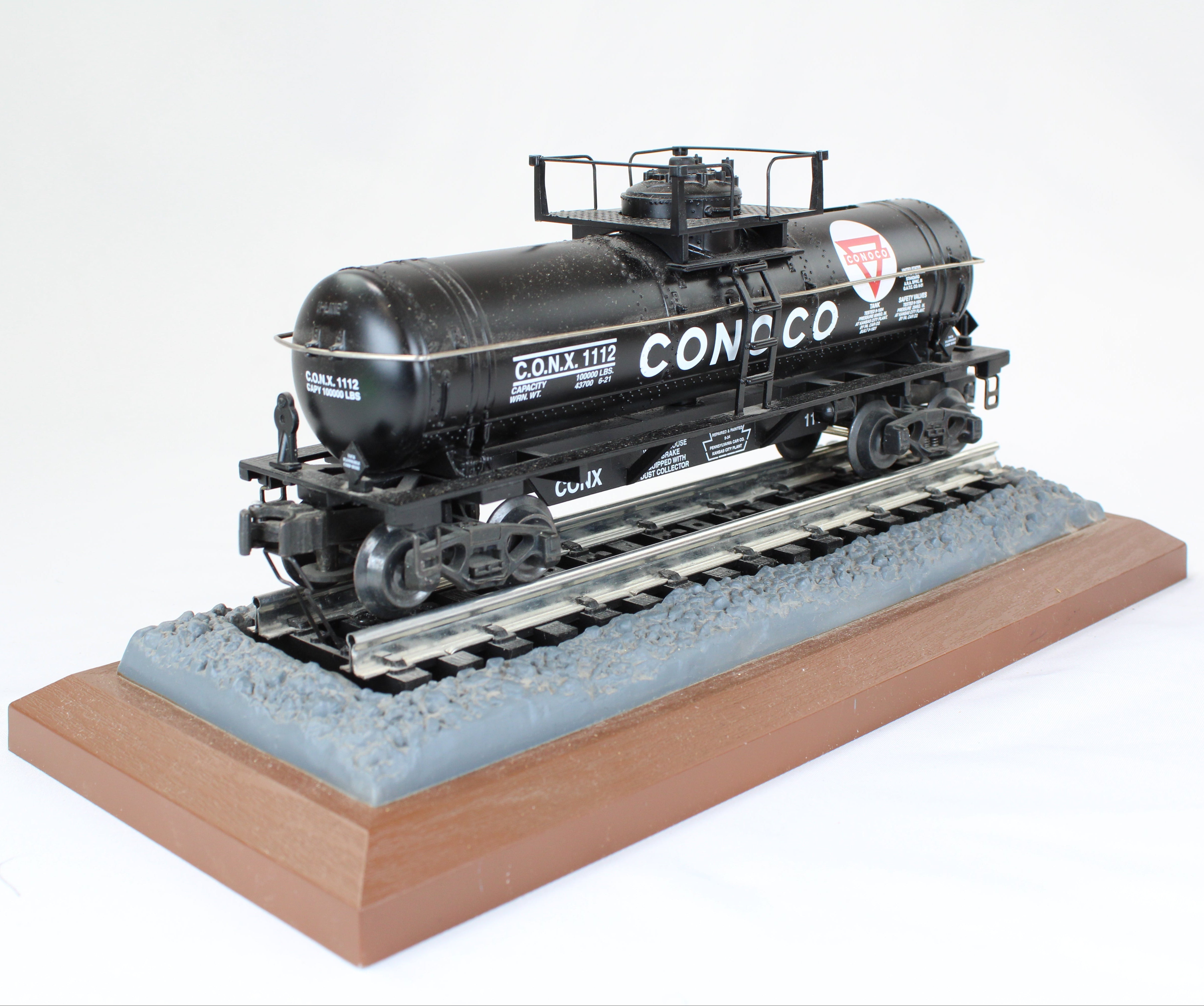 The tank car has a coin slot in the top if someone would desire to use the working model as a bank. The tank car, track, and foundation with plaque are in excellent condition.