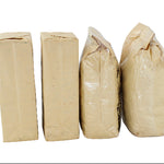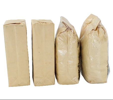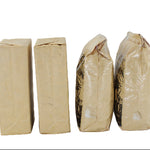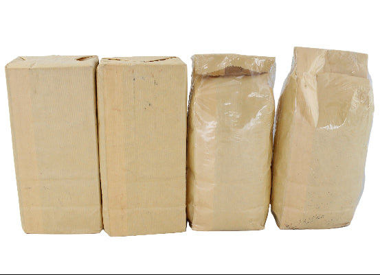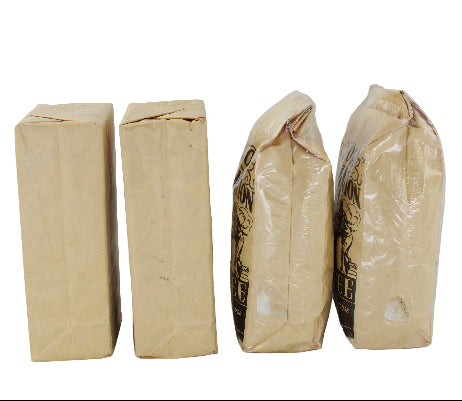 The lot includes two very well-preserved coffee packages that have been wrapped around a rectangular form to preserve shape and condition, and two rare, complete, unopened packages with coffee beans and labels that have been preserved in cellophane.