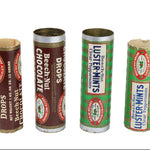 Inside each tube is the original label that would have been wrapped around the chocolate drops or mint candies. We believe these metal tubes were made for souvenirs and gift-giving.