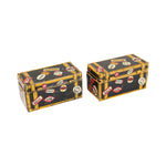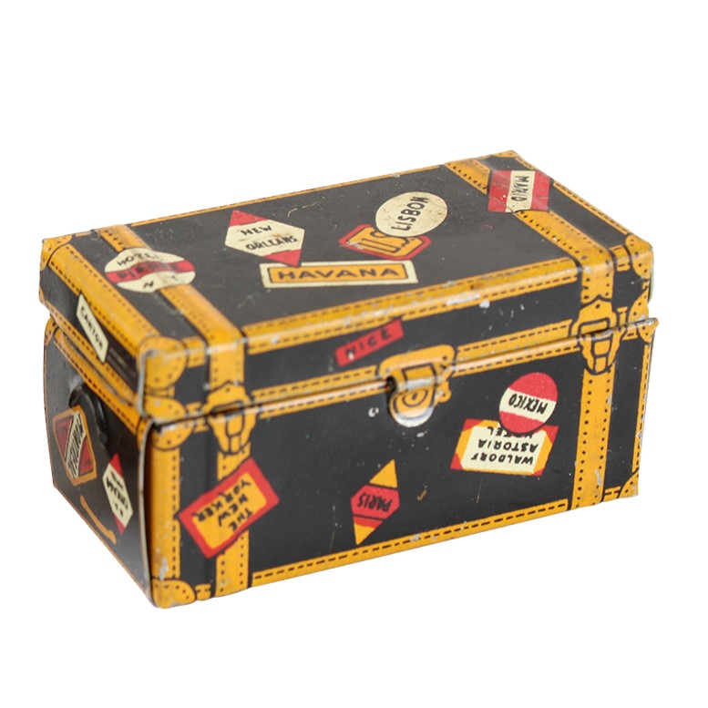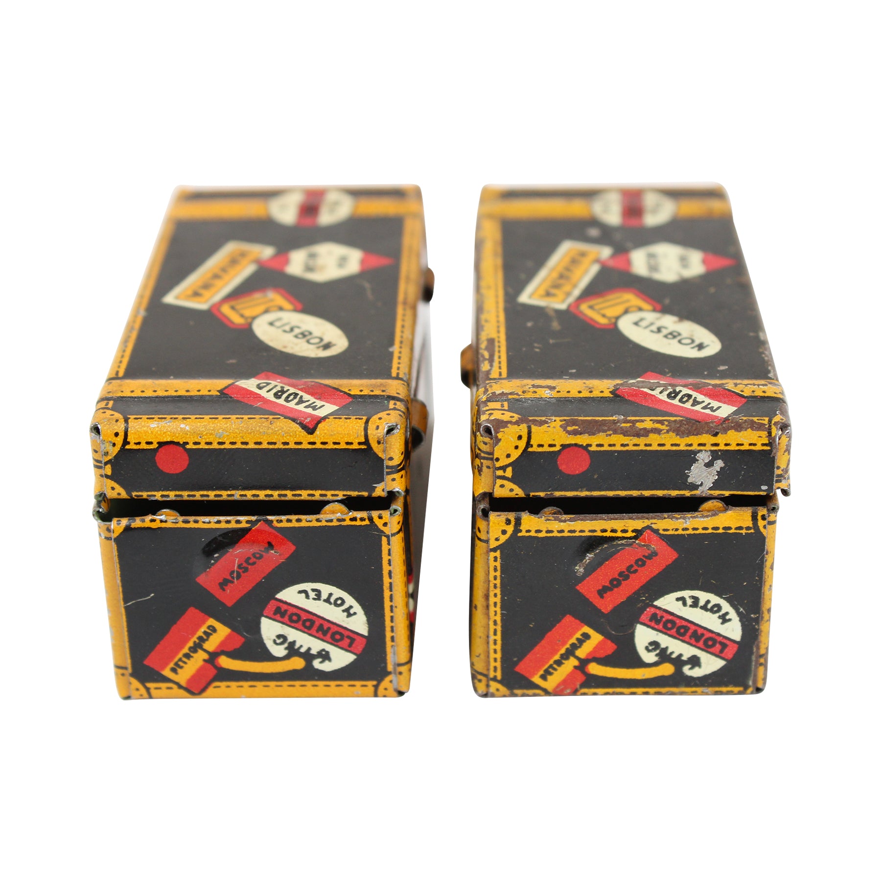 These doll-size tin litho steamer trunks harken back to a time when travel was slower and more aspirational, displaying countless destination and hotel badges from far-flung lands. Each trunk has fully functional hinged lids with latches, and the Marx logo appears on the bottom. Each trunk measures 2" wide x 1" deep x 1" tall. One trunk is in very good condition, and the other is in good condition due to some oxidation and edge wear.
