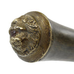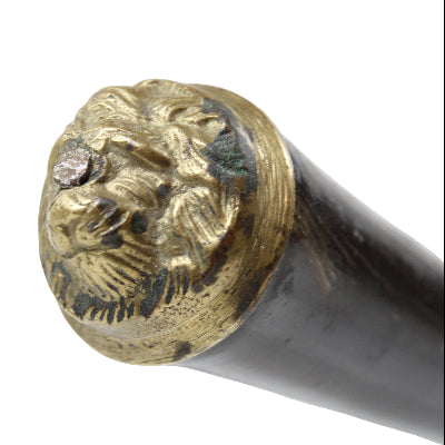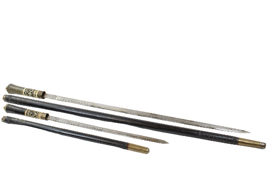 The large cane has a 31" sword inside, and the small cane has a 20" blade. Both canes are decorated with brass lion's head grips and brass bottom tips. The canes have decorated wood inlay near the grips and carving above the bottom tips.