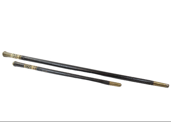 These antique canes consist of a 36-1/2" full cane and a smaller 23" long stick cane constructed and decorated the same.